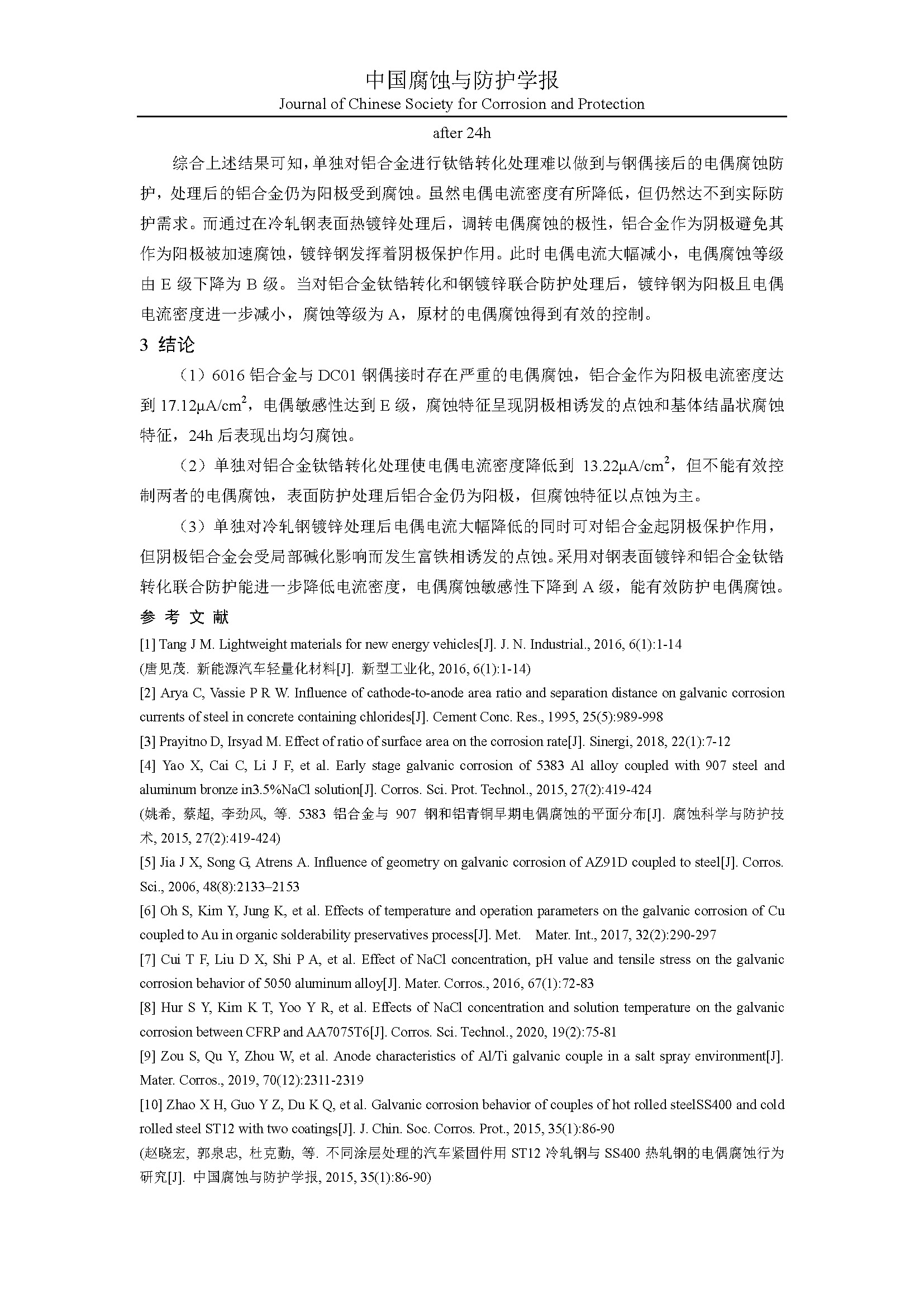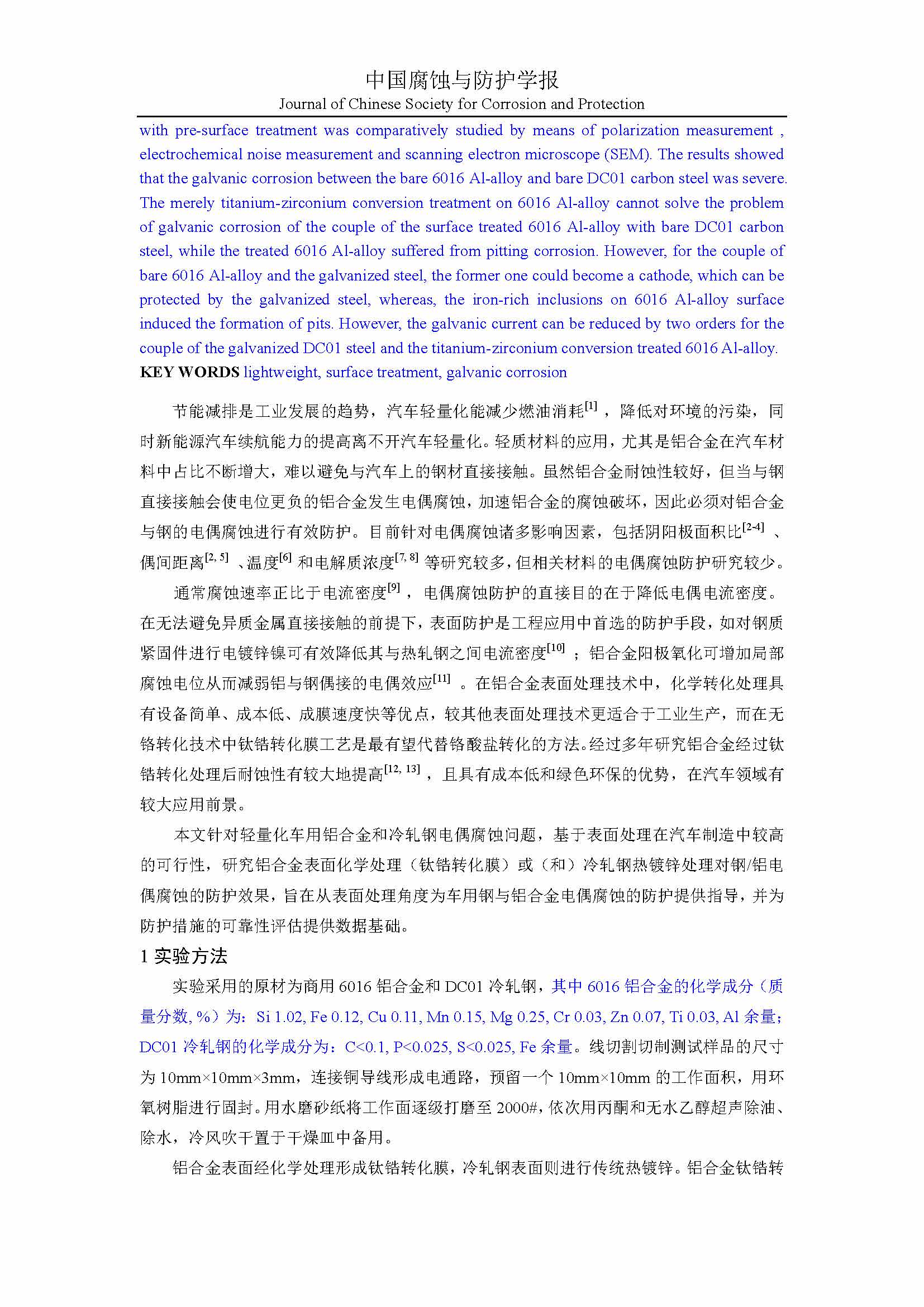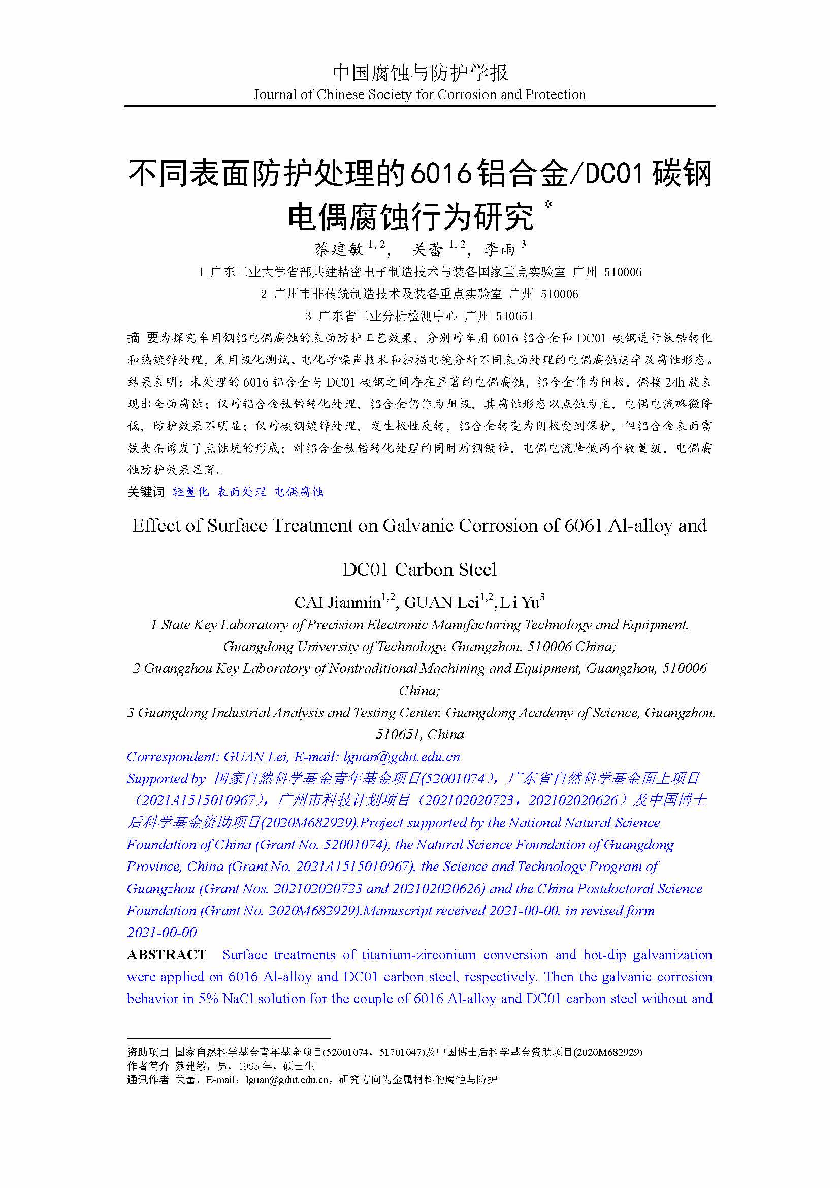 不同表面防护处理的6016铝合金/DC01碳钢电偶腐蚀行为研究