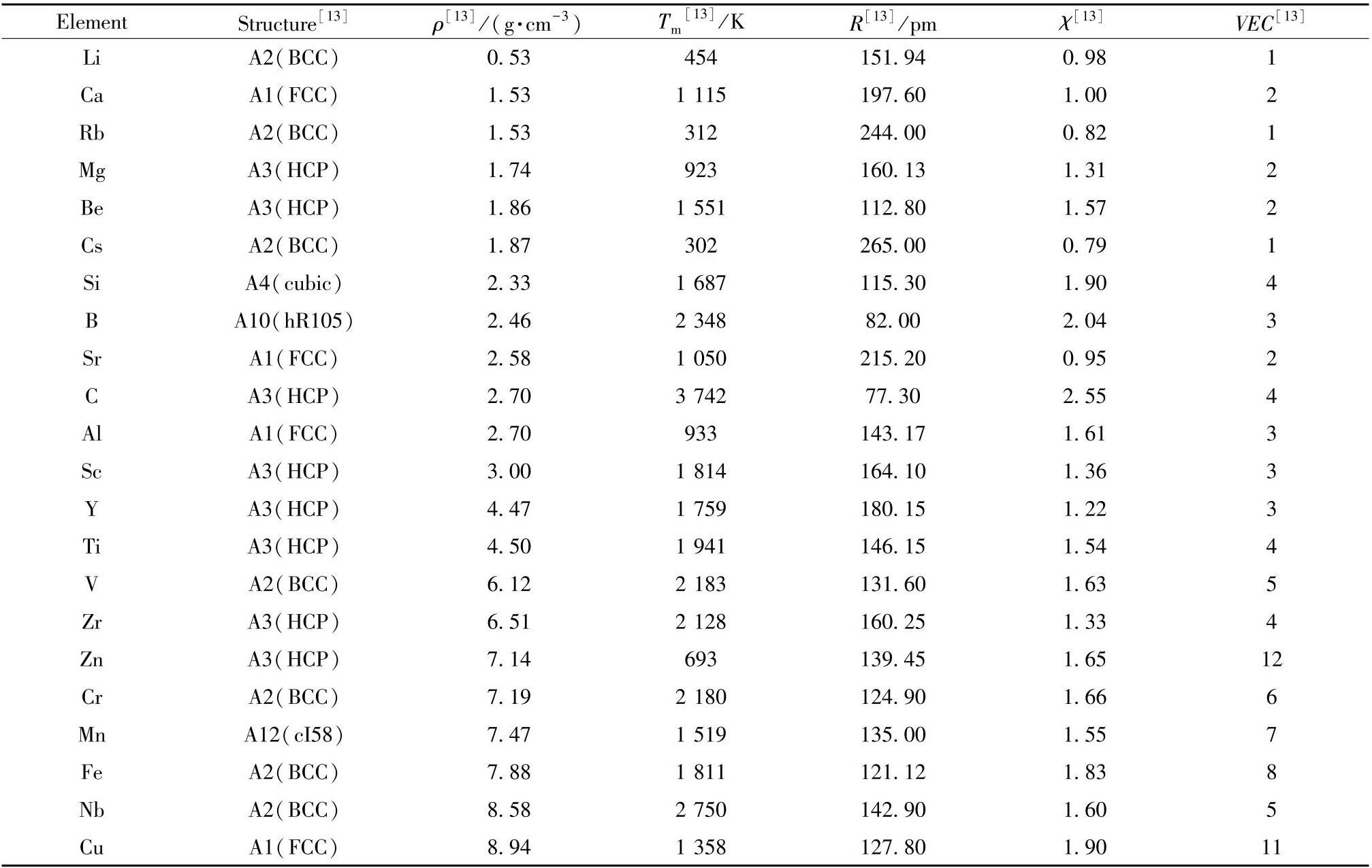 根据已有报道统计,目前用于制备轻质高熵合金的元素主要包括第二周期的金属元素Li、Be,类金属元素B、C;第三周期的金属元素Mg、Al,类金属元素Si、S;第四周期的金属元素Ca、Sc、Ti、V、Cr、 Mn、Fe、Co、Ni、Cu、Zn;第五周期的金属元素Y、Zr等[7]。表1按照密度由低到高的顺序,系统列出了可能用于制备轻质高熵合金的元素及其相关参数(包括相结构、熔点、原子半径、电负性、价电子浓度等)。按照所需的高熵合金性能,利用“鸡尾酒” 效应添加不同轻质元素,可以制备具有优良性能的多种轻质高熵合金。