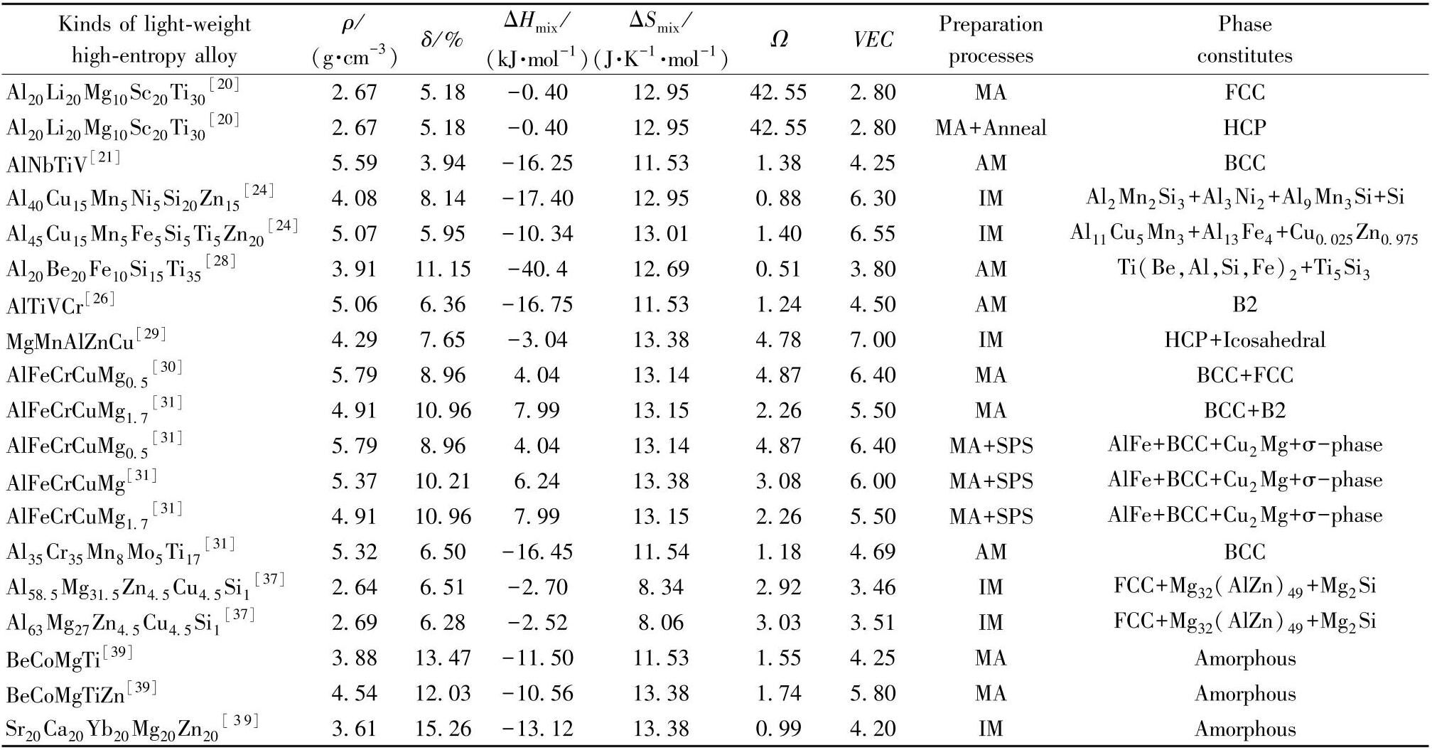 表2 部分轻质高熵合金的密度、经验参数、制备工艺以及相组成