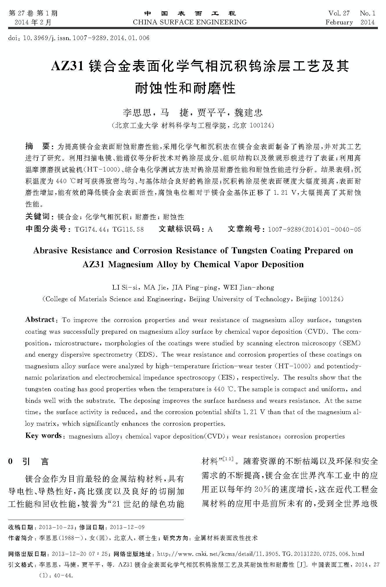 AZ31镁合金表面化学气相沉积钨涂层工艺及其耐蚀性和耐磨性