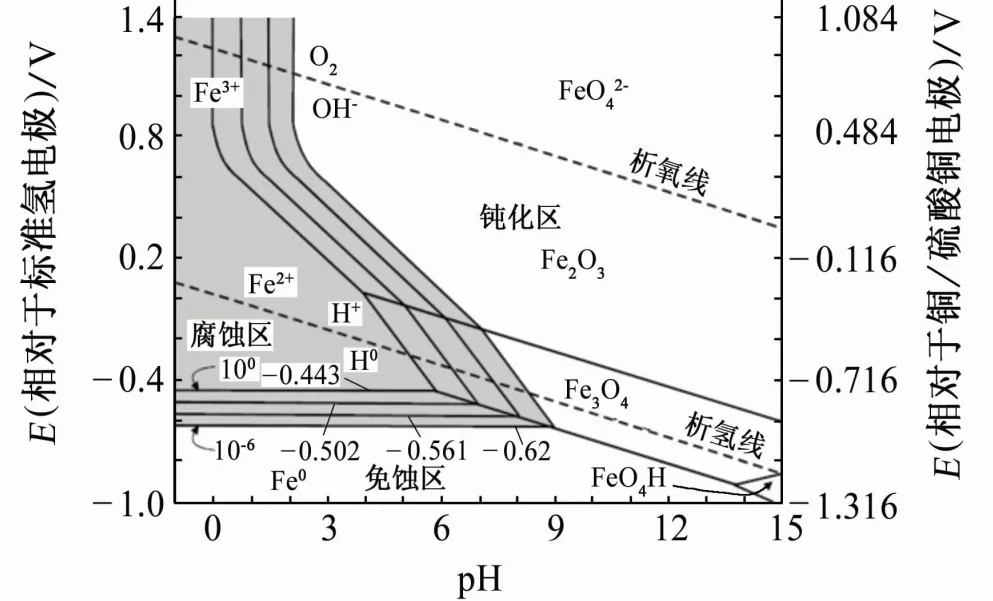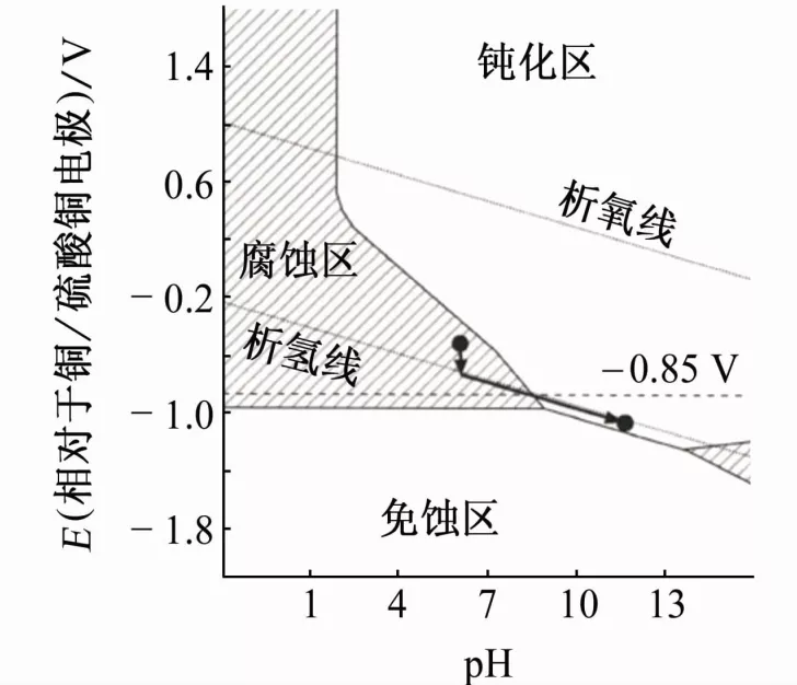 基于热力学数据所绘制的铁-水体系的Pourbaix图中存在腐蚀区、免蚀区和钝化区3种区域,如图2所示。在免蚀区内,电位和pH的变化不会引起金属腐蚀,即在热力学上金属处于稳定状态。阴极保护的理论保护电位即为金属进入免蚀区的临界电位。