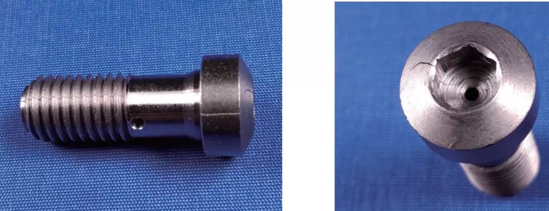 某型号汽车发动机喷油嘴使用46S20钢制圆柱头内六角螺栓进行装配固定,装配工人使用正确的扭矩进行作业时,某批次螺栓多次发生贯穿式的纵向开裂,螺栓的圆柱头与螺纹段均从外向里断裂至中心孔,如图1所示。事后调查,电子程序监控结果显示使用的扭矩符合要求,根据追溯性文件发现断裂的螺栓全部来自某供应商生产的同一批次。