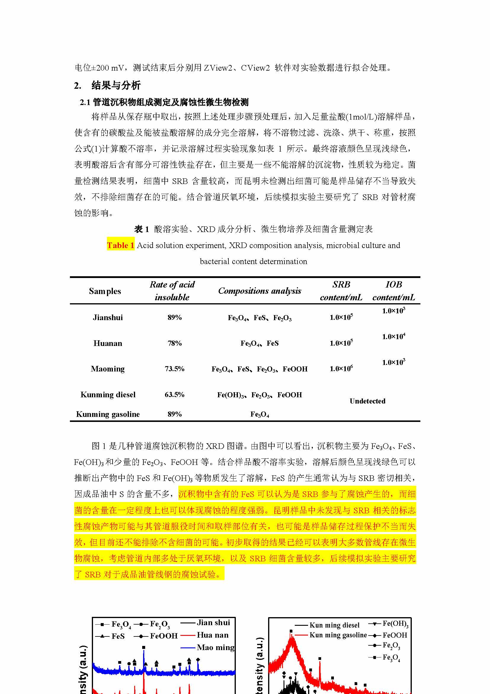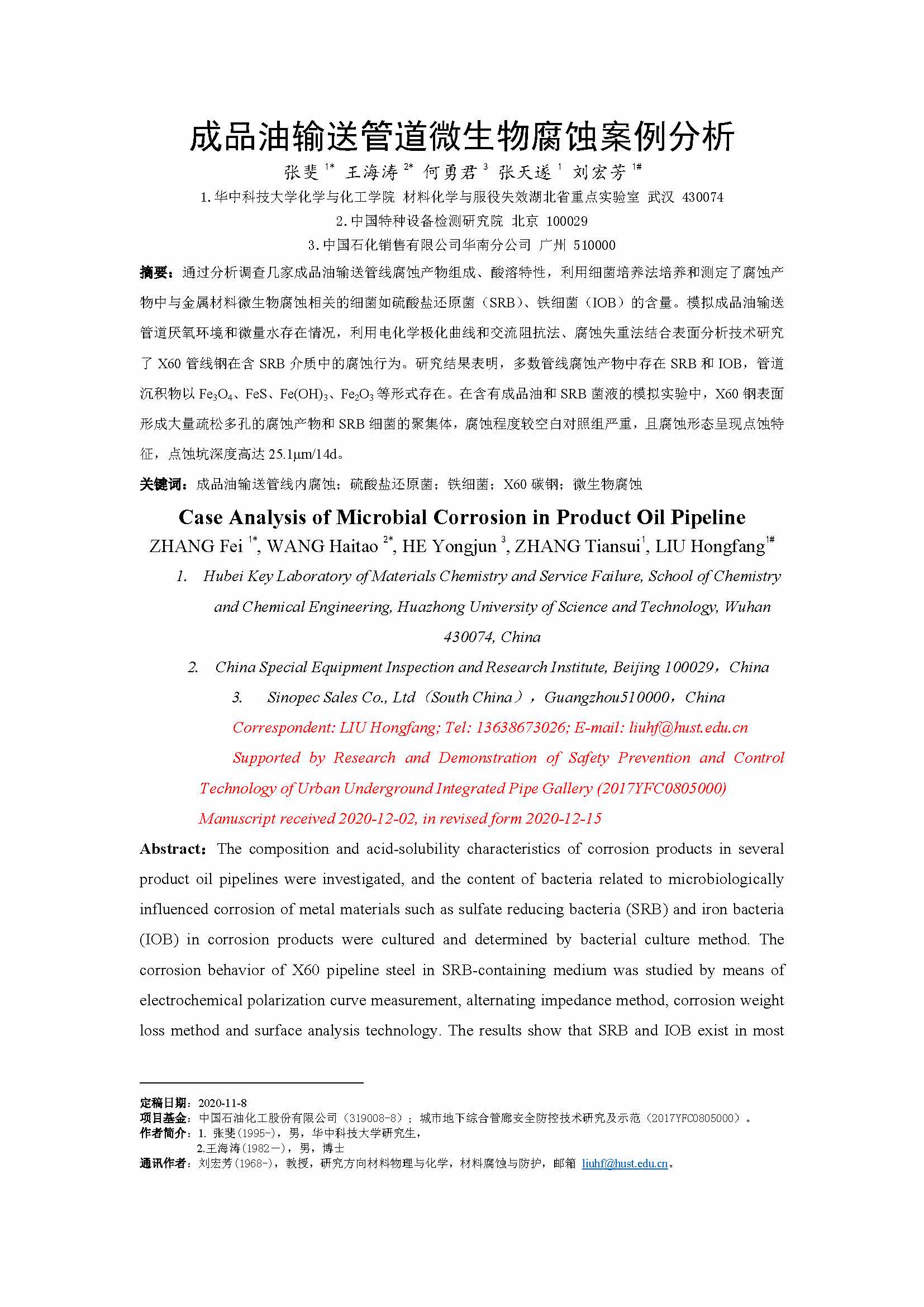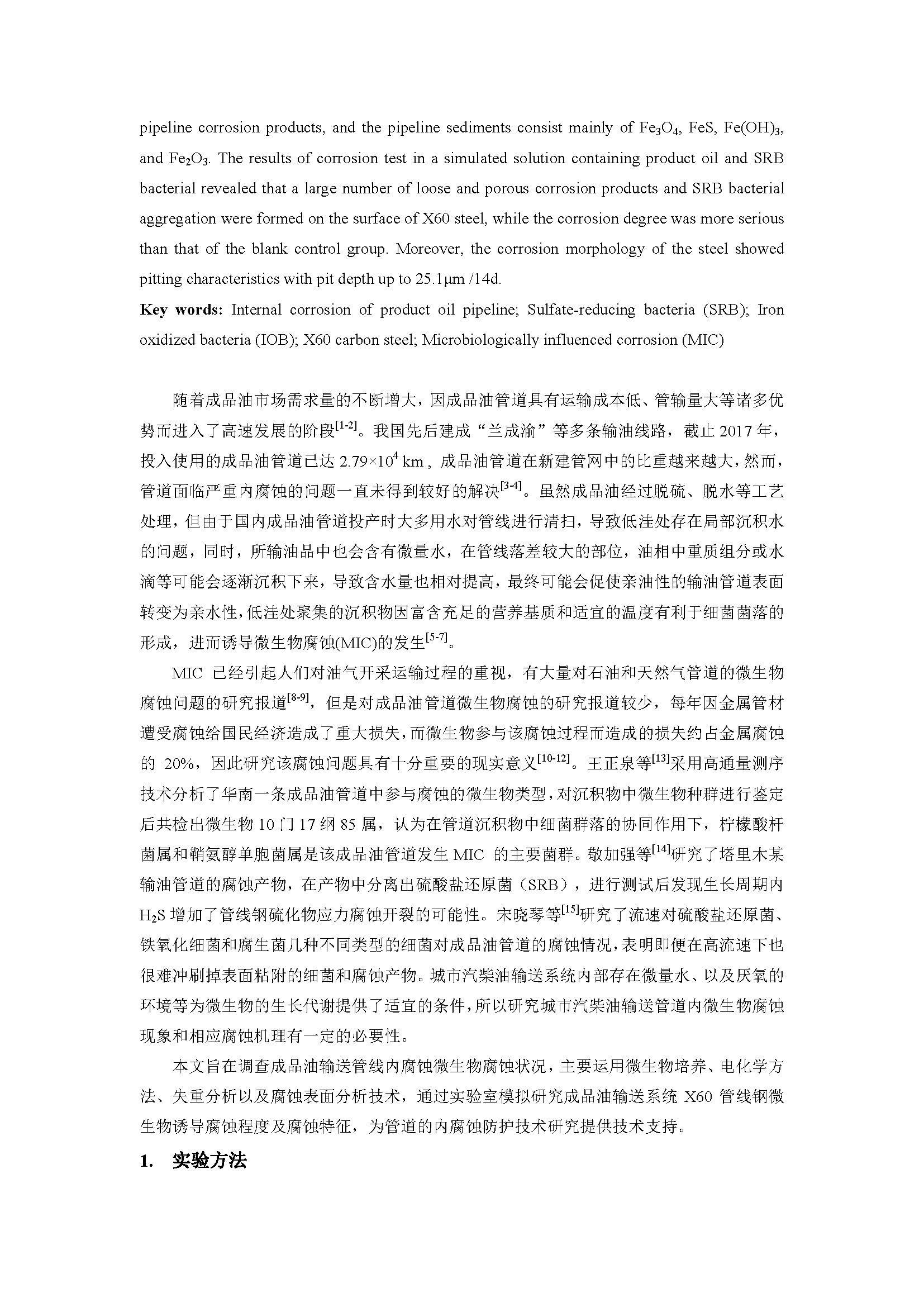 标签: 成品油输送管线内腐蚀, 硫酸盐还原菌, 铁细菌, X60碳钢, 微生物腐蚀