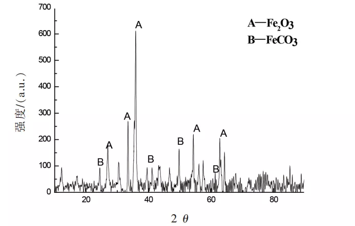 X射线衍射分析(XRD)结果如图4所示,XRD分析进一步证实了腐蚀产物主要是Fe2O3及碳酸亚铁。