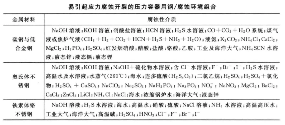 某种金属材料只有在特定的腐蚀环境中,才发生应力腐蚀开裂。下表是容易引起应力腐蚀开裂的压力容器用钢和腐蚀环境的组合。可见,几乎每一种材料都有可能发生应力腐蚀开裂。