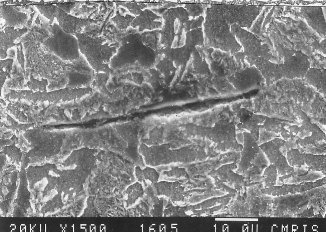 图5-58为剖面上的氢致裂纹,大裂纹的尖端两侧都有扩展的细小裂纹,图5-59为氢致裂纹的尖端,细小裂纹呈断续层状,已经开始出现沿晶的特征,并逐步连接在一起。图5-60为金属内部的MnS夹杂处氢致裂纹,MnS脱落,由于积聚的氢压不足不能引起两端开裂,图5-61为氢致裂纹在金属内部的MnS夹杂处,MnS还没有脱落,一端已经开裂。