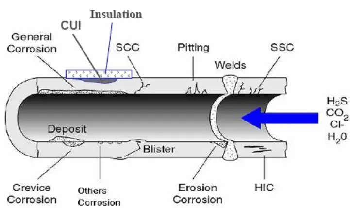 随着油气田的深度开发,H2S、CO2和Cl-引起腐蚀问题日益严重,对于油气田采出水中高含Cl-、H2S、CO2、高矿化度的介质(复杂环境),既要考虑介质中的Cl-腐蚀,又要考虑H2S和CO2、垢下腐蚀等腐蚀,这给设备的选材、制造和使用带来了极大地困难。这类压力容器面临的腐蚀问题如图5-54所示。