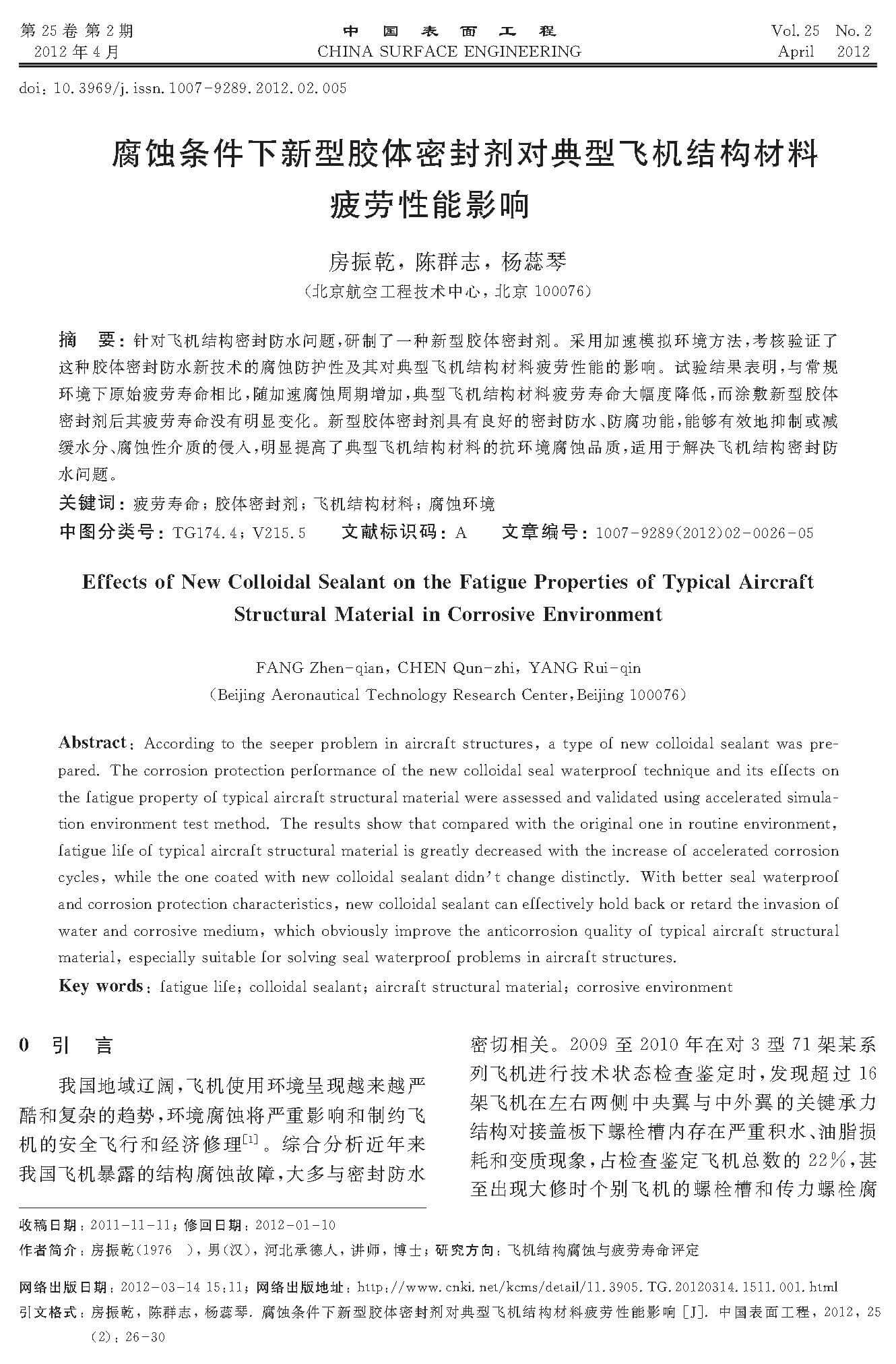 腐蚀条件下新型胶体密封剂对典型飞机结构材料疲劳性能影响