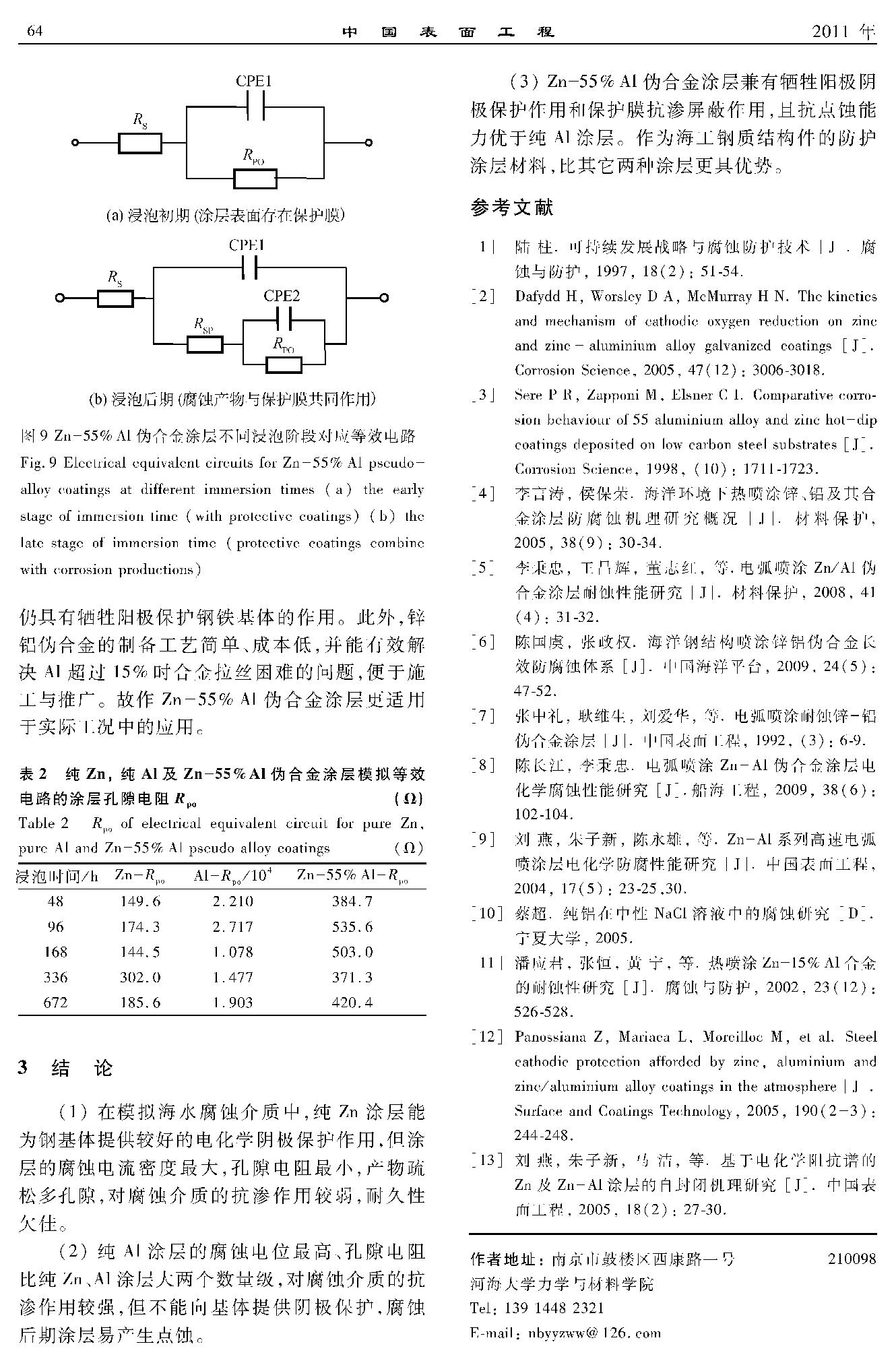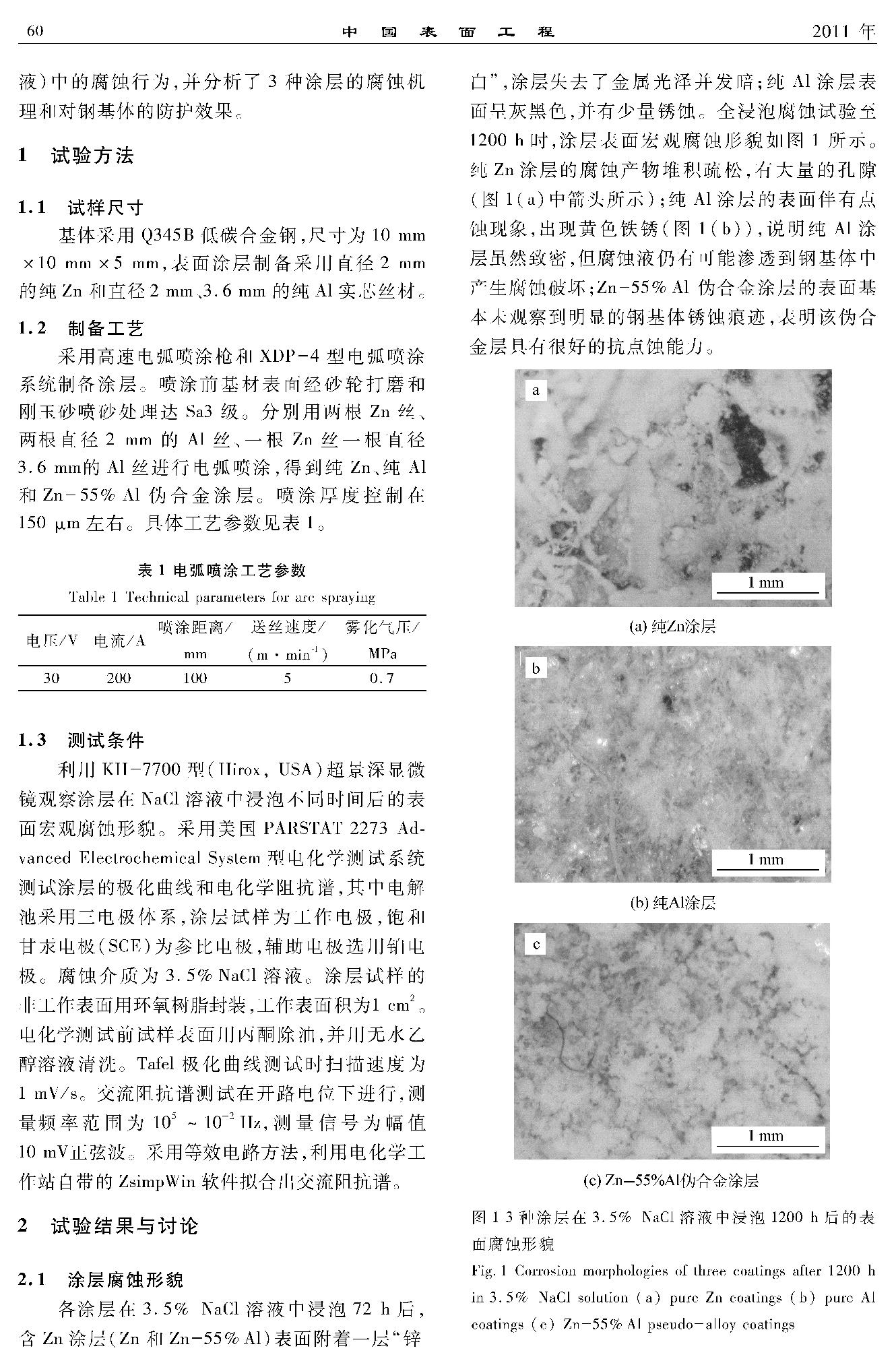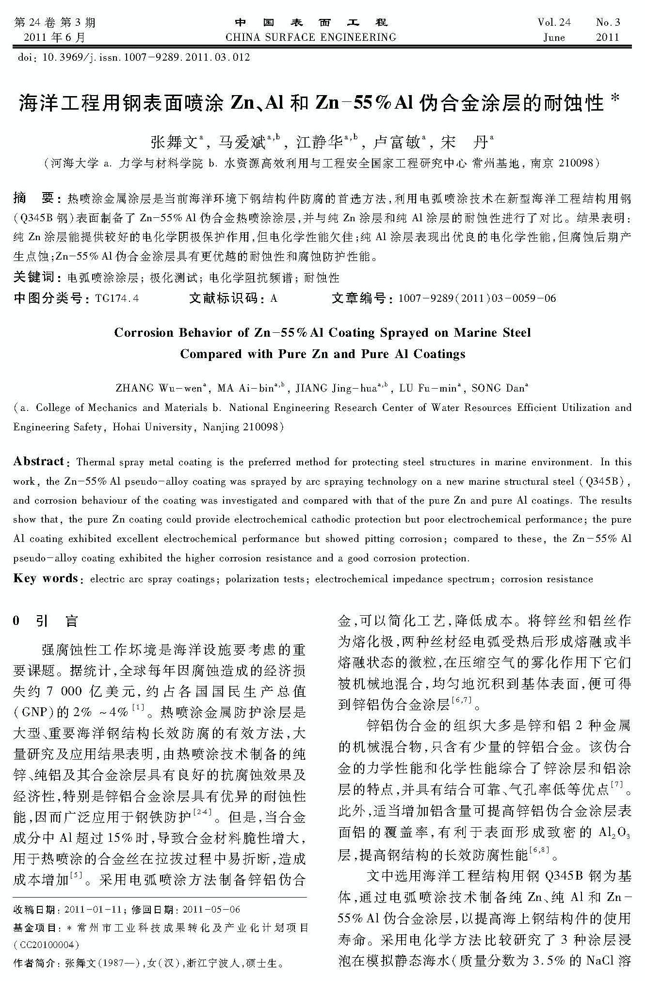 海洋工程用钢表面喷涂Zn、Al和Zn-55%Al伪合金涂层的耐蚀性