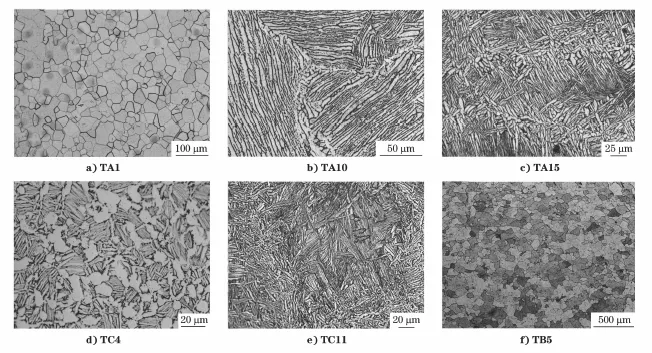 图6为按照前述金相制样方法得到的部分钛合金的显微组织形貌。图6a)和图6f)分别为TA1纯钛和TB5合金的等轴组织;图6b)、图6c)和图6e)分别为TA10、TA15和TC11合金的网篮组织;图6d)为TC4合金的双态组织。由图6可见,这些合金的显微组织无划痕,晶界清晰,无氧化色,有效地去除了变形黏结层干扰,显示出钛及钛合金显微组织的真实形貌,制备的金相试样符合检验要求。
