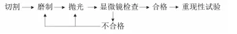 钛及钛合金的常规金相试样手工磨抛方法包括粗磨(一般2道次)、细磨(一般4道次)、粗抛、精抛等7~10个道次磨抛步骤,不仅对操作技巧要求高,而且费时、耗力,很难磨制出合格试样。研究人员采用某公司生产的半自动磨抛机磨抛试样,其动力头顺时针旋转,转速为100r·min-1。首先是确定硬度中等的TA10钛合金的磨抛工艺参数,如研磨磨盘转速、试样压力、磨料类型、磨抛剂等,然后根据不同钛合金的硬度值(见表1)设计出其他钛合金的抛磨参数,再经过反复试验,不断调整工艺参数(试验流程见图1),最终仅需1~2个道次的磨制和抛光即可获得合格的金相试样,大幅提高了制样效率。