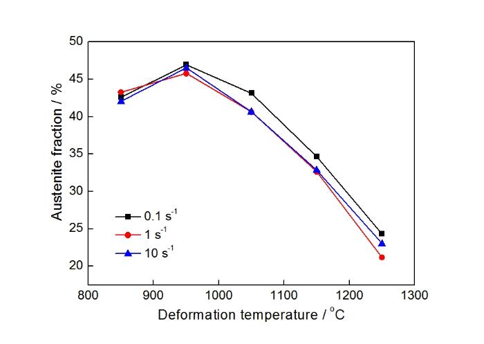 图3 在不同热变形条件下试样显微组织中奥氏体含量的变化
