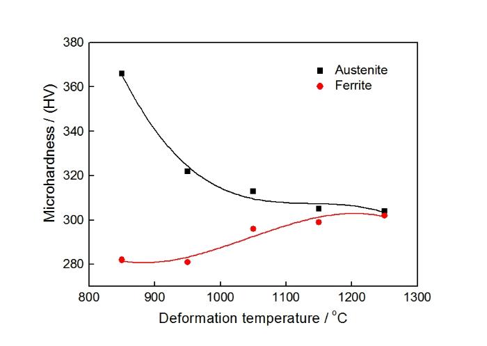 图4 变形温度对铁素体和奥氏体显微硬度的影响