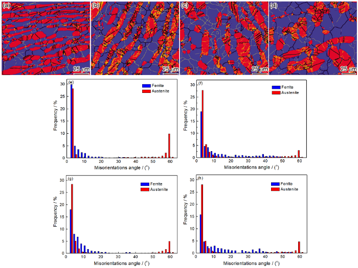 为了进一步研究2205 DSS在高温压缩过程中的软化机制,在变形温度为1050℃、应变速率为0.1 s-1的条件下对2205 DSS进行了真应变ε分别为0.05、0.3、0.5、0.8的高温圧缩实验。不同变形量试样的光学显微组织,如图5所示。从图5a可见,真应变为0.05时在试样的显微组织中可以观察到大量细小的奥氏体分布在铁素体相中。随着变形量的增大部分奥氏体在厚度方向明显长大发生宽化,如图5d所示。为了对不同变形量下试样中奥氏体与铁素体两相组织进行系统的分析,在扫描电子显微镜下对热变形淬火后的试样进行了EBSD分析,结果如图6所示。图6a~d给出了试样的EBSD相组成图,图中蓝色代表铁素体,红色代表奥氏体。图6e~h给出了相邻晶粒间的取向角差分布,将小于15°的晶界定义为小角度晶界,用黄色实线表示;将大于15°的晶界定义为大角度晶界,用黑色实线表示。