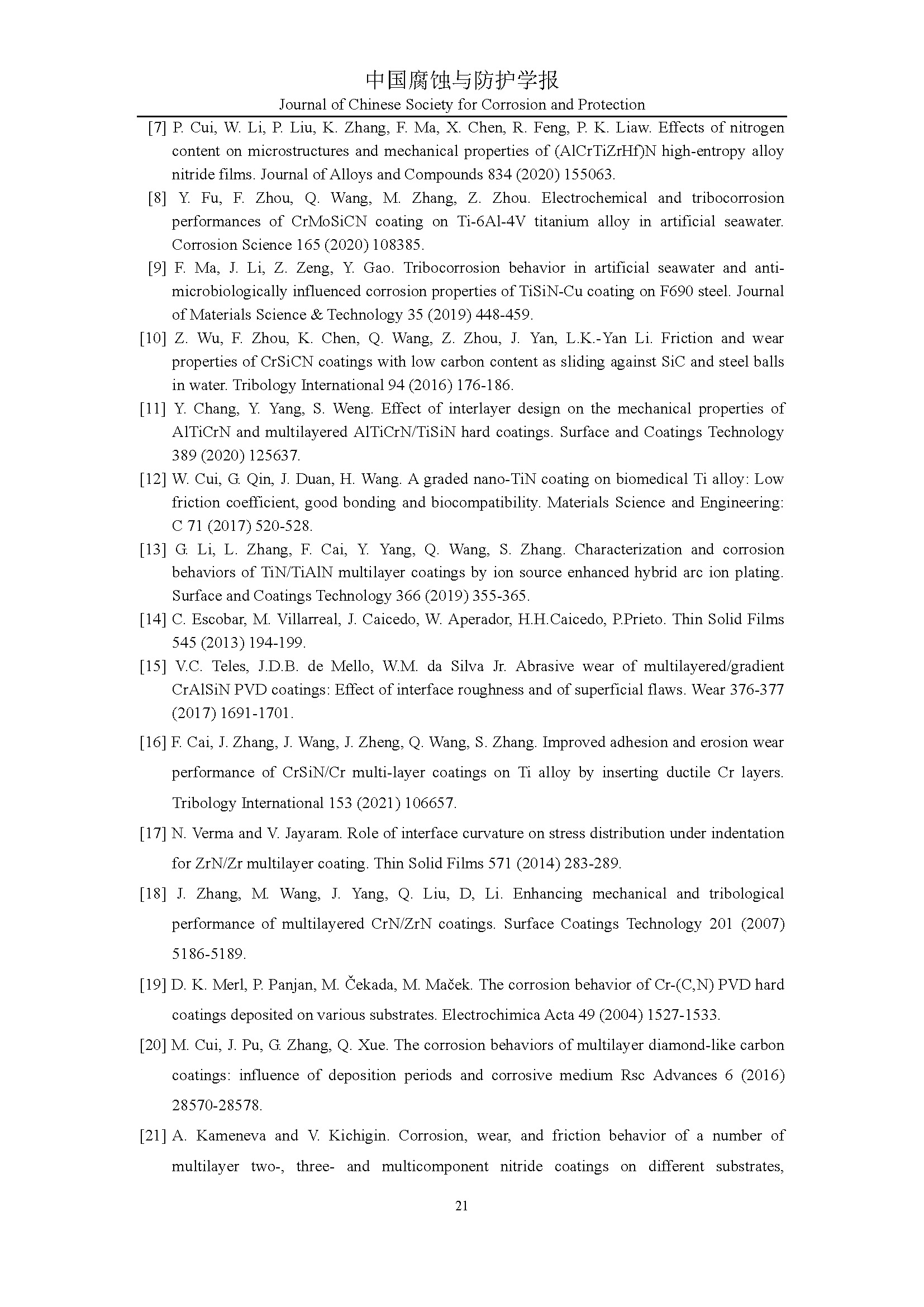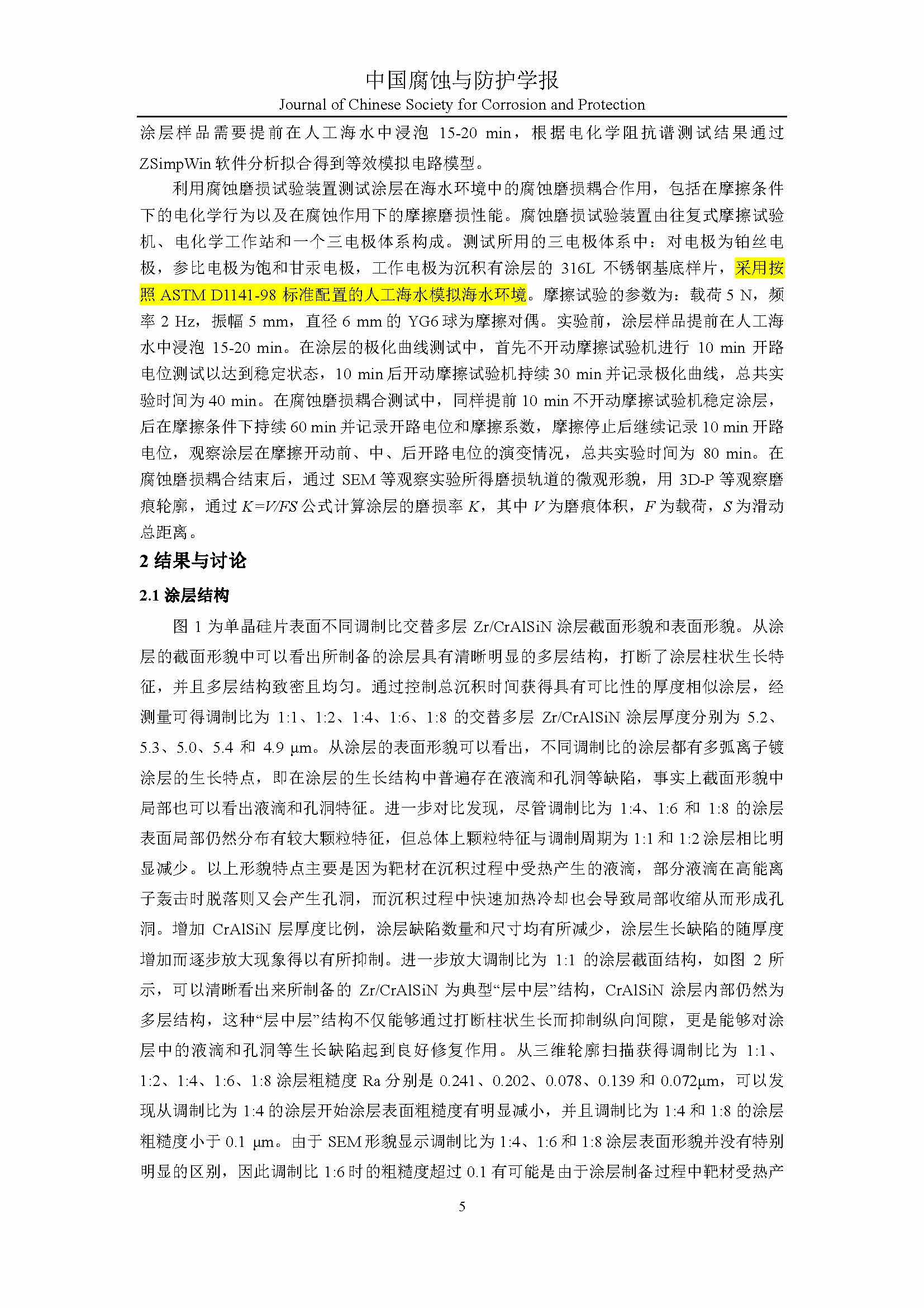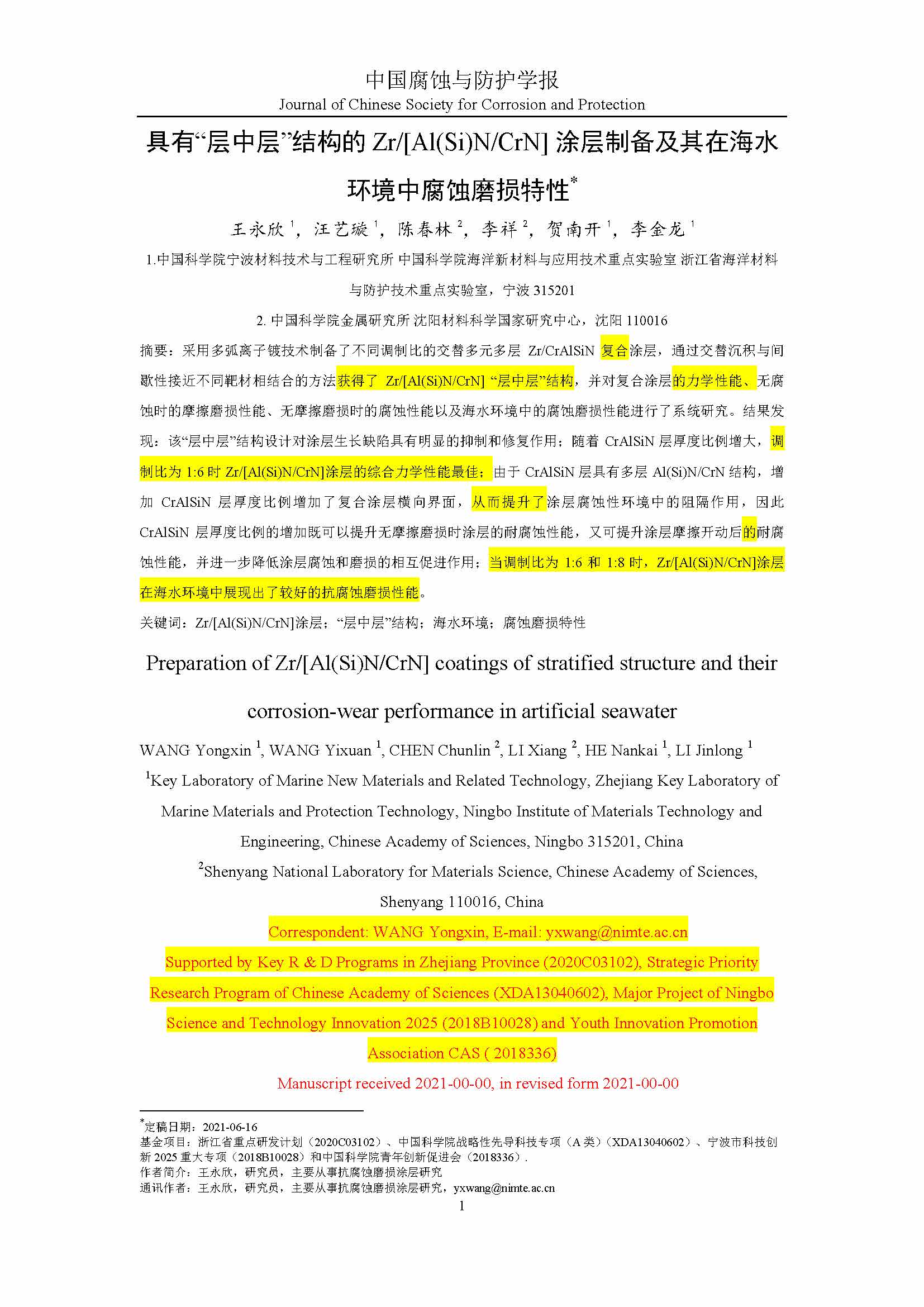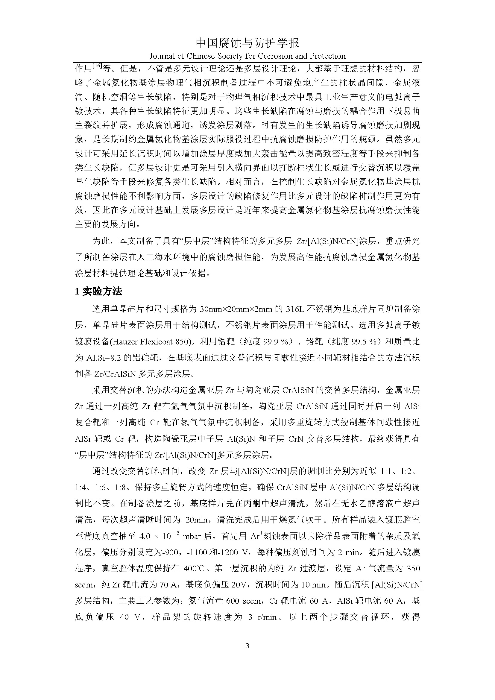 标签: Zr/[Al(Si)N/CrN]涂层, “层中层”结构, 海水环境, 腐蚀磨损特性