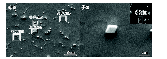 Fig.5 SEM images of alloy which was adding mischmetal rare earth La、Ce、Sm: (a) alloy ALCS; (b) amplication of C point