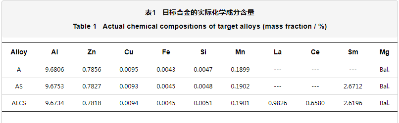 实验所用材料为AZ91D、Mg-30%Sm、Mg-30%Ce、 Mg-30%La合金。采用真空熔炼的方法制备目标合金AZ91D、AZ91D+3.0%Sm、AZ91D+1.0%La+0.7%Ce+3.0%Sm。为了方便,将3种实验合金依次命名为A、AS、ALCS。经过等离子体原子发射光谱仪 (ICP-AES) 分析,测得目标合金的实际成分含量,结果如表1所示。