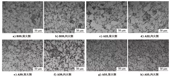根据DL/T 773—2016 《火电厂用12Cr1MoV钢球化评级标准》,对各管道的向火面和背火面的显微组织进行观察,结果如图3所示,并对各管道的显微组织进行珠光体球化评定。