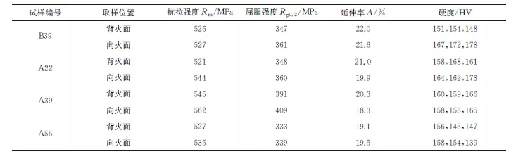 为评估材料的性能,从每个管道的背火侧和向火侧各取两个试样,在试验机上进行室温拉伸试验,试验温度为24℃,取两个试样实测结果的平均值。根据DL/T 438—2016《火力发电厂金属技术监督规程》,对试样进行硬度试验,室温拉伸试验和维氏硬度测试结果见表2。
