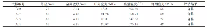 12Cr1MoV 钢管的额定蒸汽工作压力为17.47MPa,在进行强度校核时,对实测金属壁厚进行环向应力计算,计算结果如表3所示。