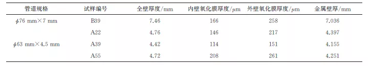 由表1可知:只有A39管道的全壁厚度是负偏差,其余管道均为正偏差;只有B39管道的金属壁厚未发生减薄,A55管道的内外壁氧化膜总厚度超过450μm,这表明再热器管道在工作时出现超温现象,管道在超温环境中,氧化剧烈,导致氧化膜厚度过厚。