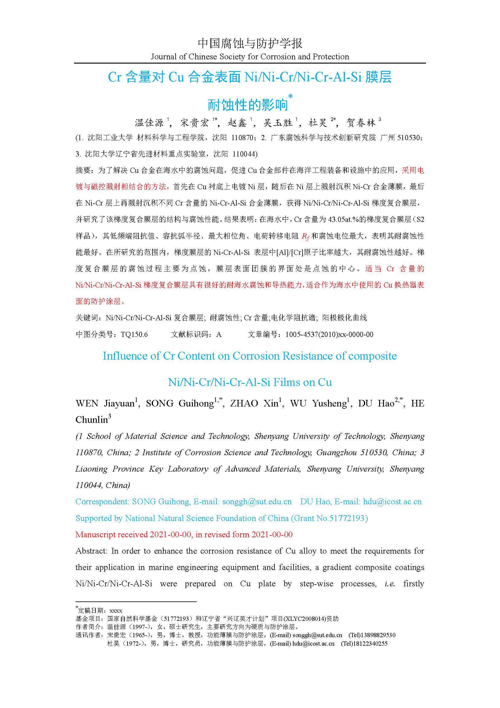 Cr含量对Cu合金表面Ni/Ni-Cr/Ni-Cr-Al-Si膜层耐蚀性的影响