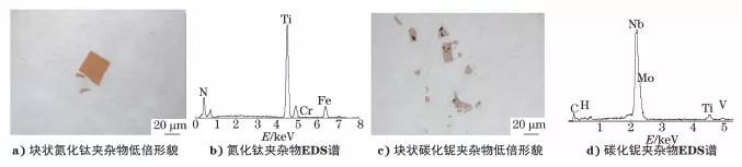 图11 块状氮化钛及颗粒状碳化铌夹杂物微观形貌及EDS谱