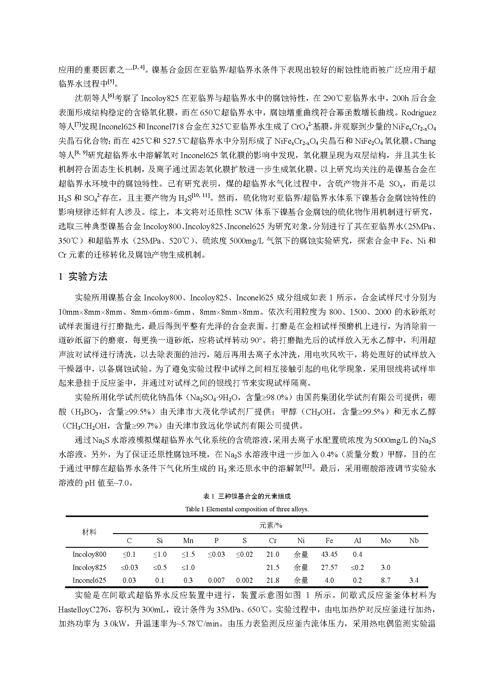 亚临界/超临界水条件下镍基合金(Incoloy800 825 625)的硫化腐蚀特性研究