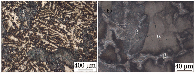 铸态AZ80镁合金的显微组织:(a) 50×(b)500×