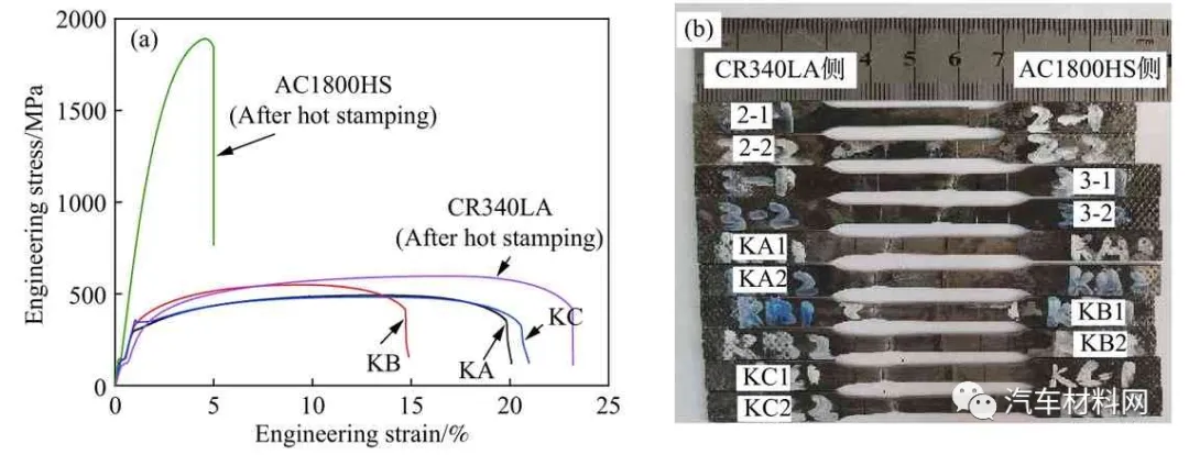 图10 热成形后U型件应力应变曲线(a)及拉伸试样断裂位置(b)