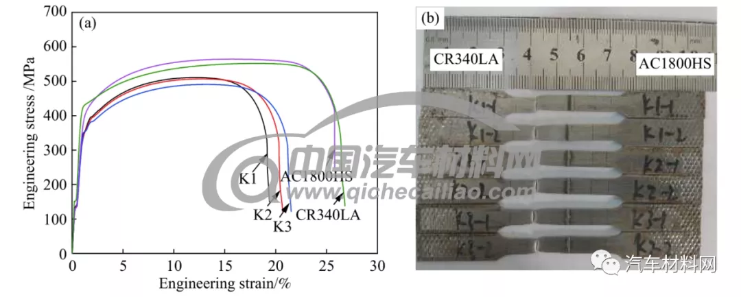 Fig.9 Stress-strain curve (a) and fracture location (b) of the tensile specimens of the laser tailor-welded blanks