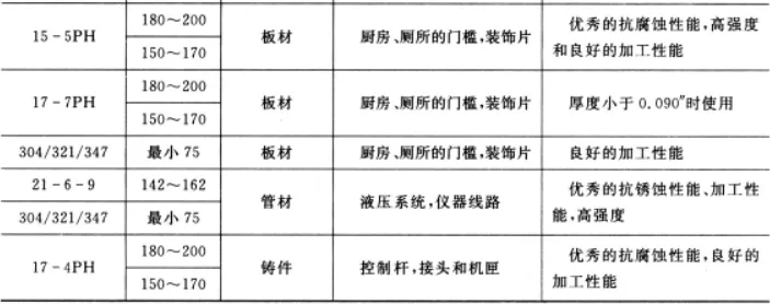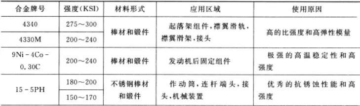 一般来说,约有12%~16%的飞机基本结构是用合金钢(包括不锈钢)制作的。其最大的优点是具有高强度(见表2)和高弹性模量,其应用见表3。