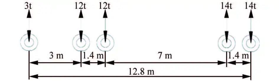 统计表明,该大桥主要通过车辆为20吨与55吨重车,载荷布置如图3所示。可以看出,轴重主要集中在12~14吨,因此采用13吨单轴载荷(单轴两侧双轮胎)作为分析基准载荷,车轮在重载下与地面的接触面积取200mm×300mm。