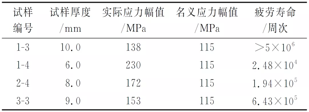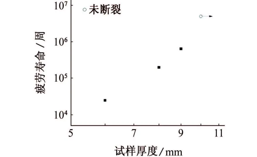 可以看出,当试样厚度为10mm时,试样具有无限寿命(5×106循环周次未失效)。当厚度为9mm时,随着试样厚度的降低,疲劳寿命大幅降低。当试样平均厚度降低到6mm时,剩余寿命仅约为20000周次。