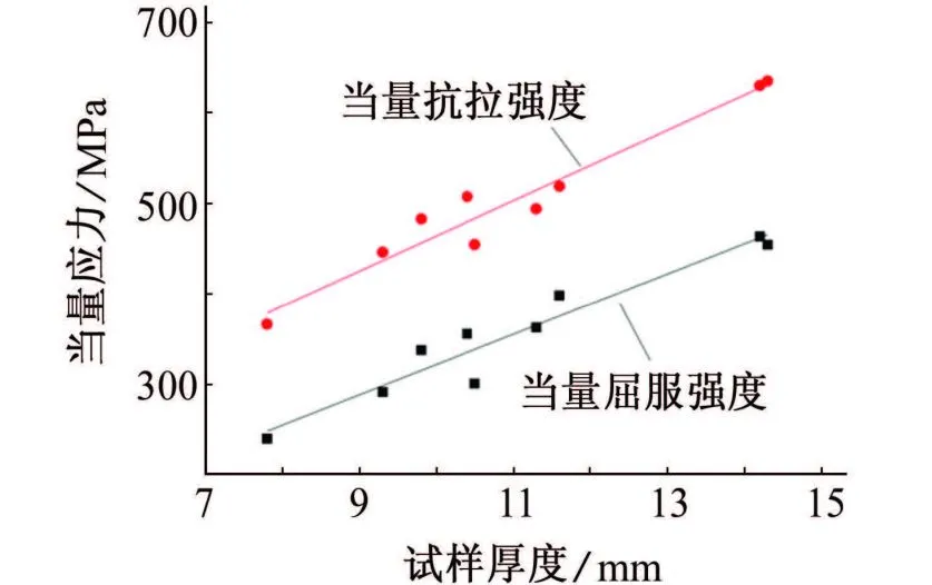 图9 试样当量屈服强度和当量抗拉强度随试样平均厚度的变化