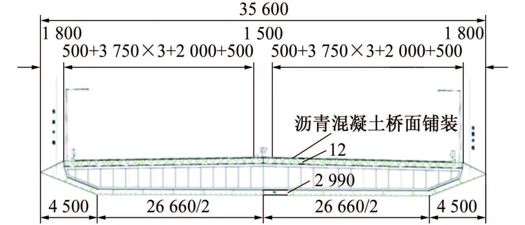 图1 钢箱梁结构标准横断面(单位:mm)