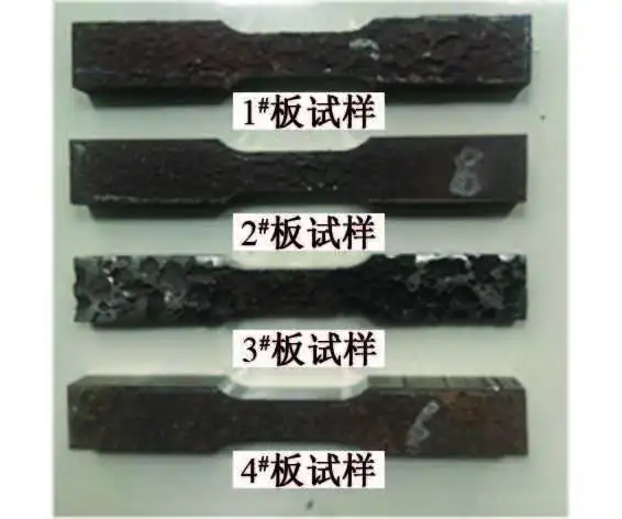 为了评估服役20年后桥面板的剩余拉伸强度,从服役悬索桥上截取4块腐蚀较典型的桥面板样板,其中一块为带焊缝样板,同时取未服役的库存替补样板试样(厚度为14mm)进行对比,从样板上取样,用三维形貌仪测量试样的表面形貌,具体如下: