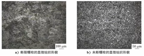 结果表明,螺栓的硬度、抗拉强度、屈服强度和断后伸长率均符合标准要求,但是断裂螺栓的冲击吸收能量仅为25J,远低于标准要求,表明断裂螺栓材料的脆性大,抵抗冲击载荷的能力低。未断裂螺栓的冲击吸收能量为86J,符合标准要求。