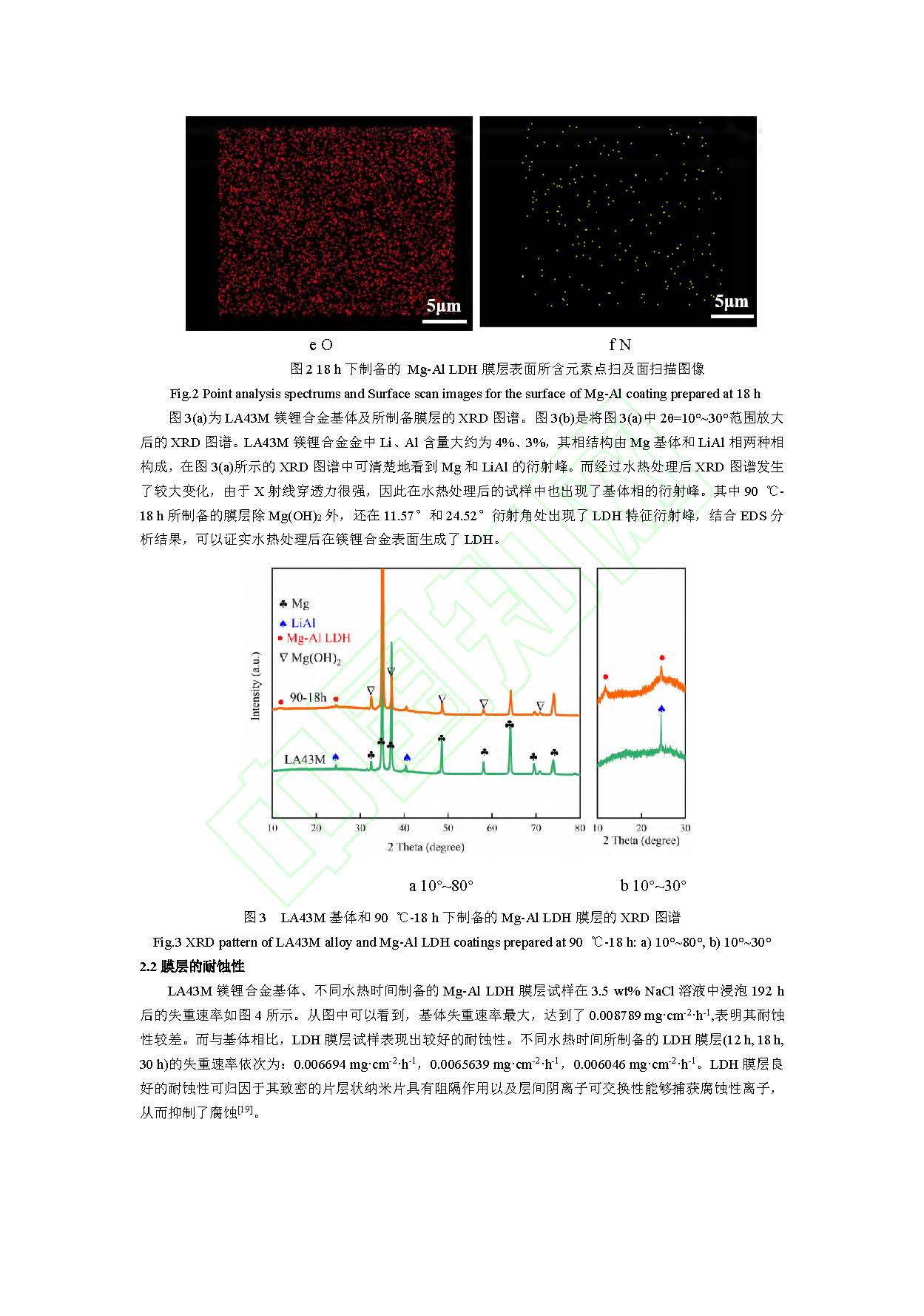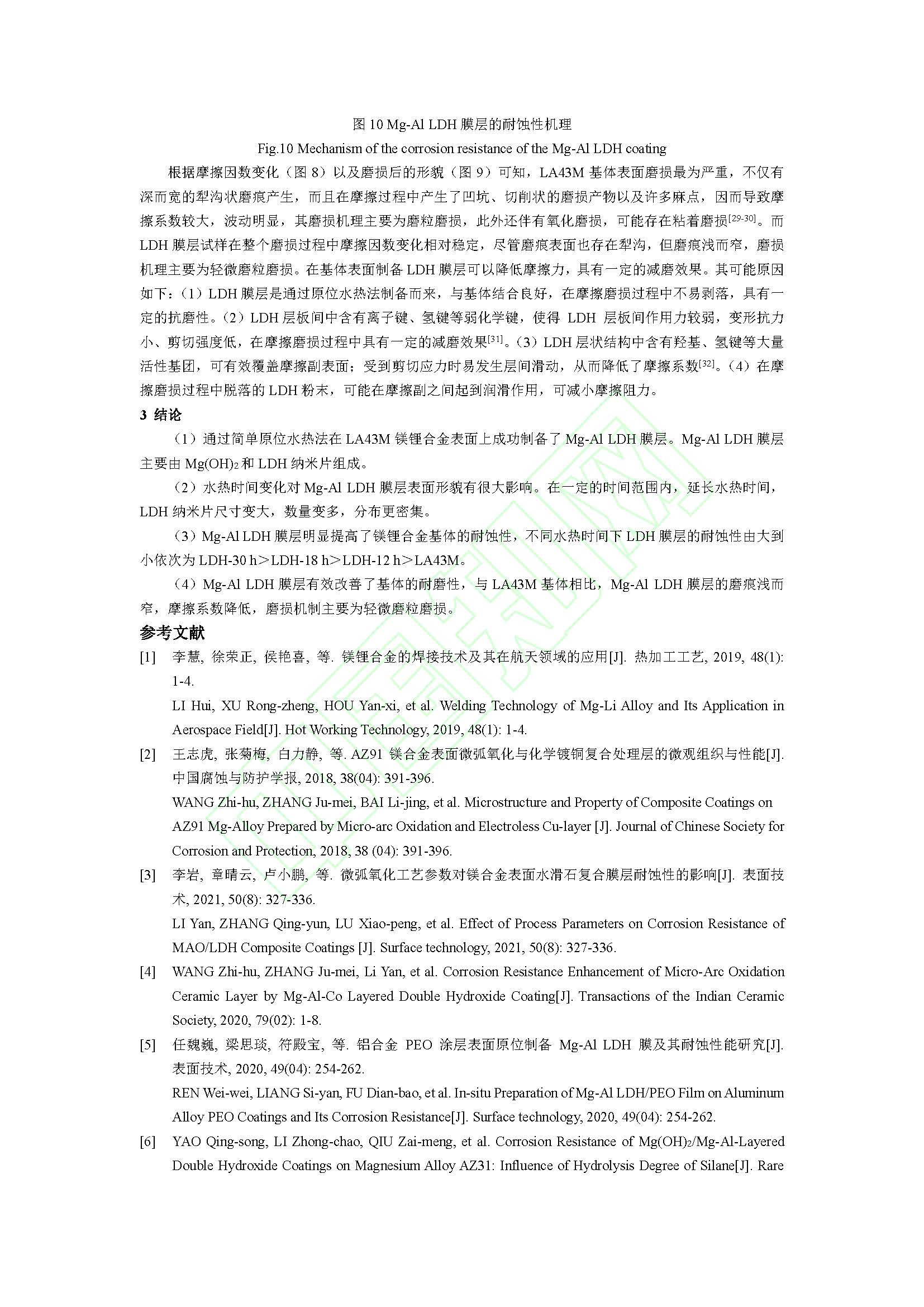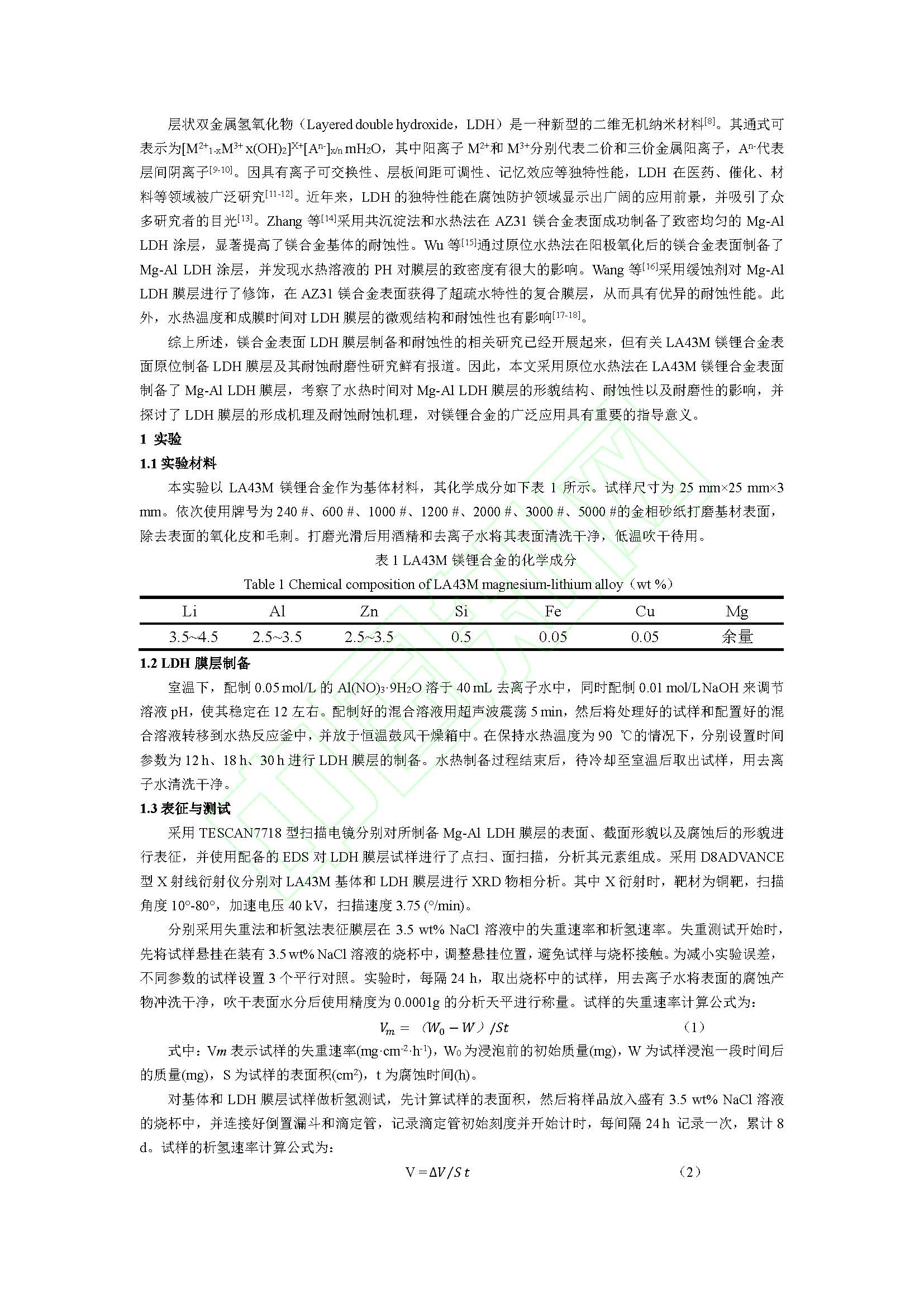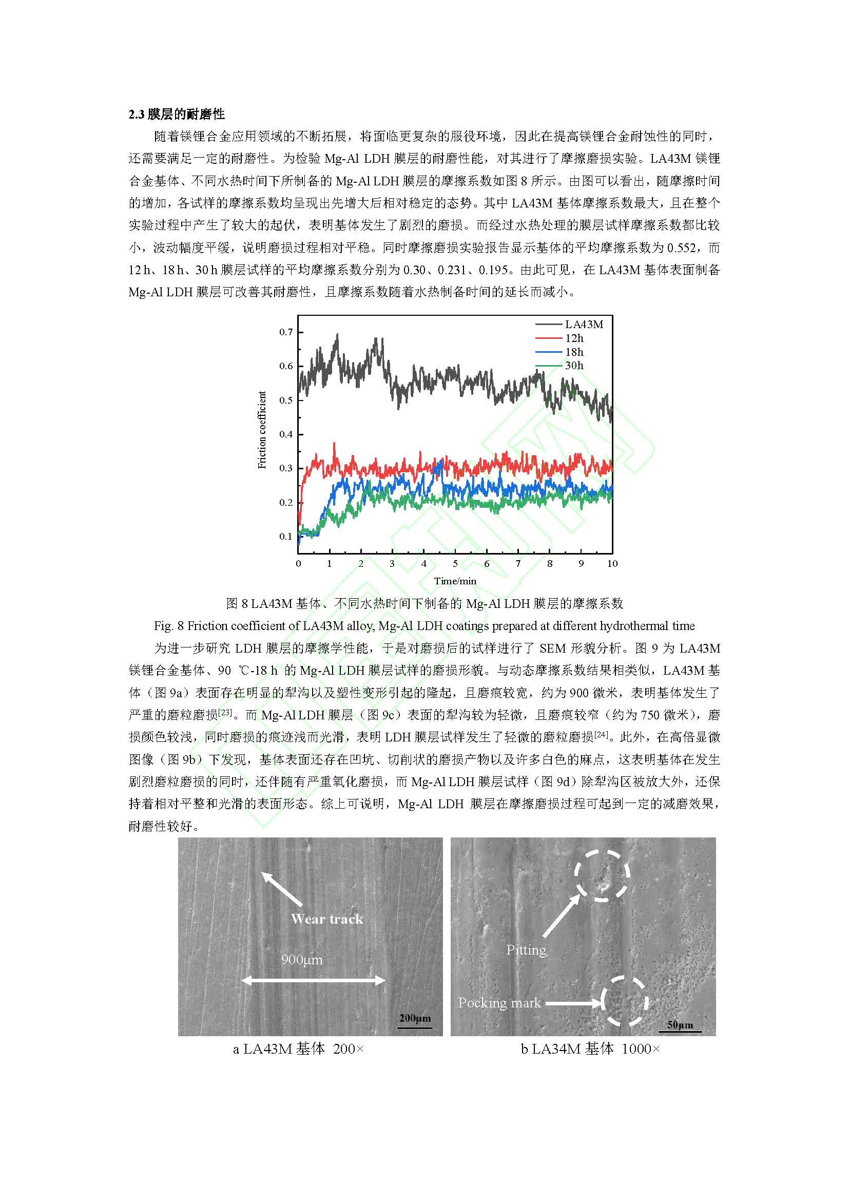 LA43M 镁锂合金表面水热合成 Mg-Al LDH 膜层的耐腐蚀及磨损性能