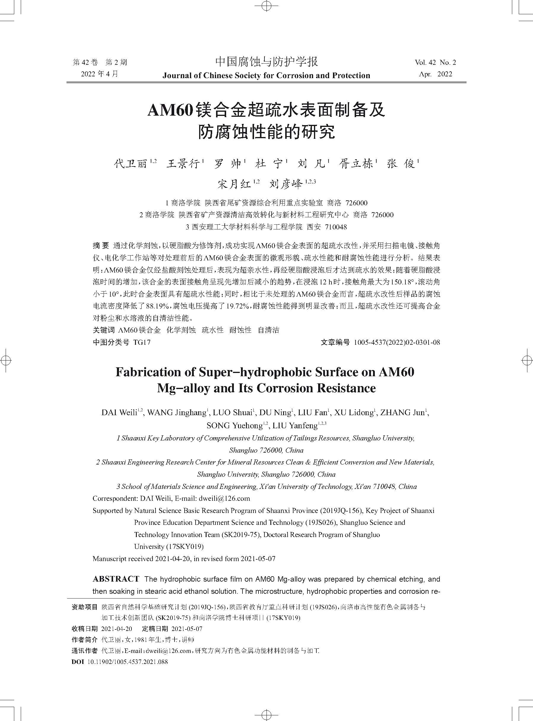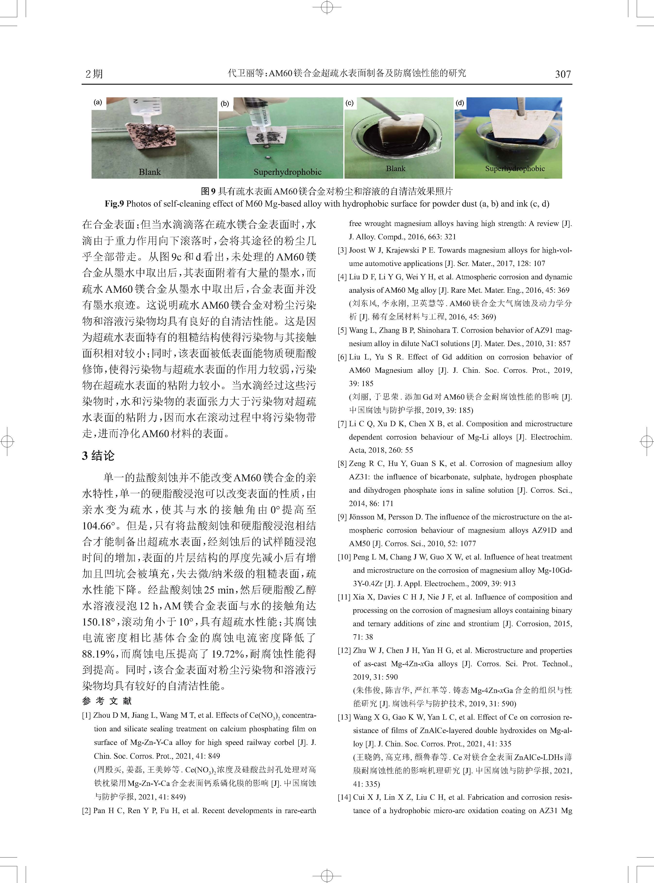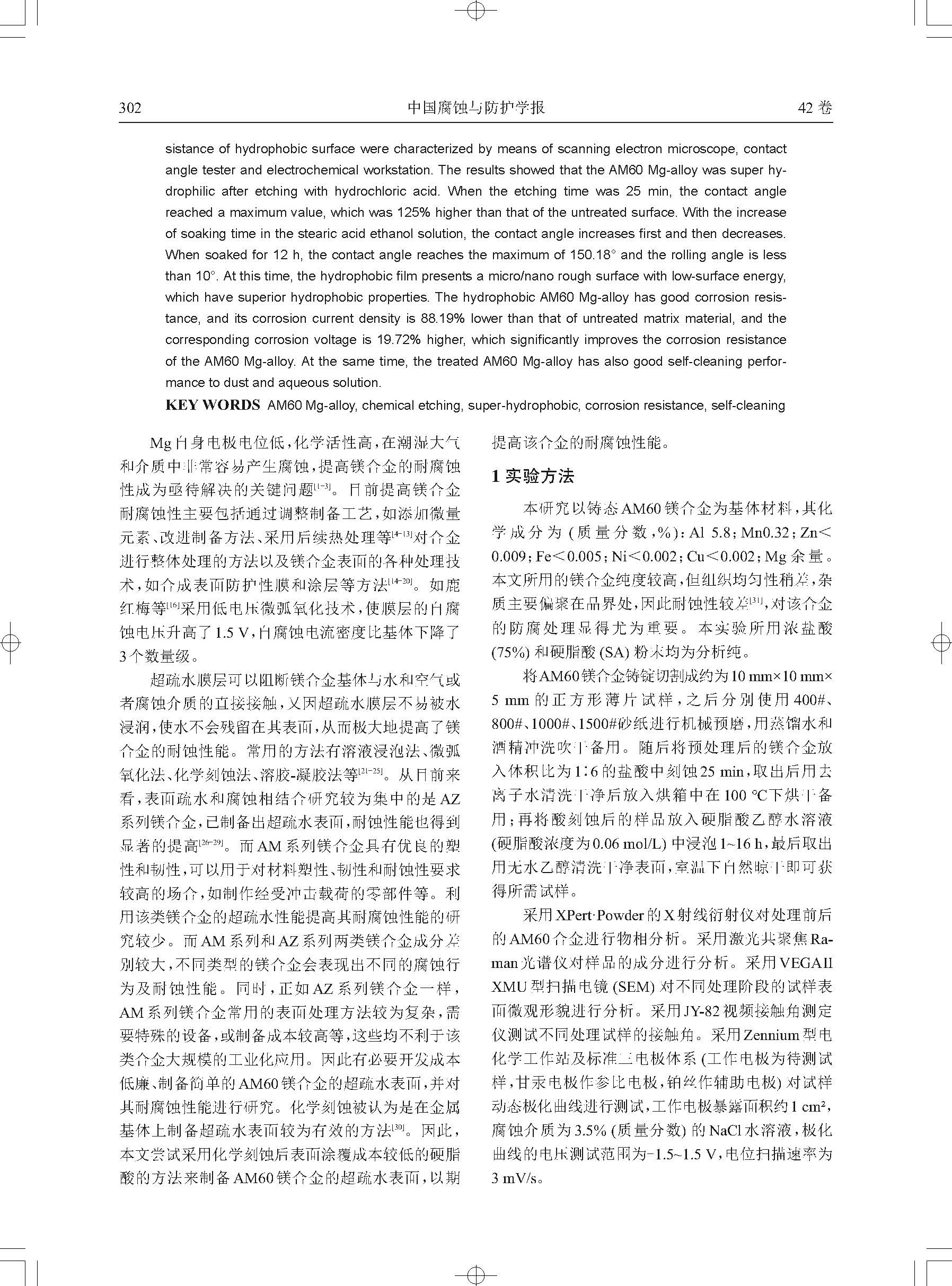 标签: AM60镁合金 ; 化学刻蚀, 疏水性, 耐蚀性, 自清洁