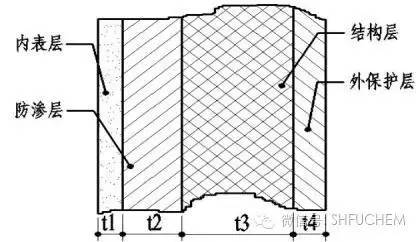 同时在制作过程,宜采用现场整体缠绕工艺,在整个吸收塔的玻璃钢层次结构示意图如下:内衬层(含内表层、防渗层)→结构层→外保护层