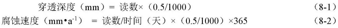 平衡电位器是这样选择的,其刻度范围为0~1000,此范围与探头元件的有效金属损失相对应。例如,一个丝状探头元件,厚2.0mm,此探头的有效厚度损失为1.0mm,这相当于在元件周围0.5mm的穿透深度。因而,将0.5mm的金属损失与平衡电位器上刻度的变化相对应,经过一段时间之后的穿透深度(总腐蚀)或者平均腐蚀速度可由下述关系确定: