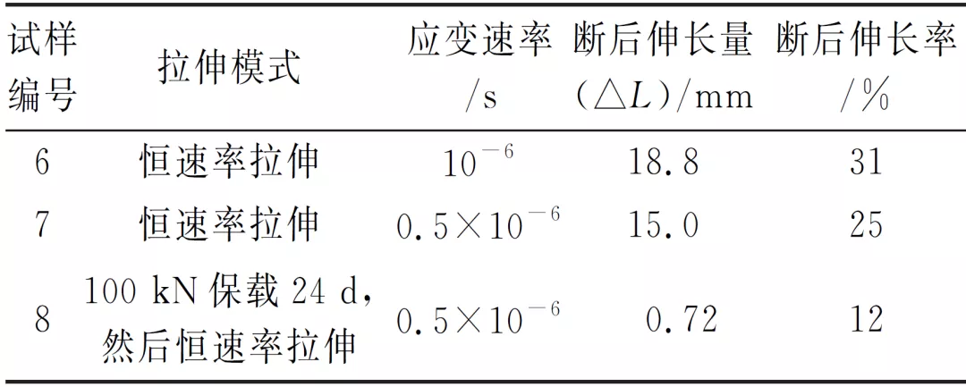 根据小尺寸试样的试验结果,试验溶液采用3.5%NaCl溶液,外加电位为-1.2V,对大尺寸试样进行SSRT,加载方式及试验结果如表2所示。大试样在SSRT过程中,全程施加-1.2V外加电位。表2中8号试样保载24天的目的是增加腐蚀因素对试样的作用时间。