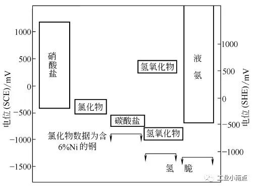 c.探测初期腐蚀。在上文所述简单的钝化-活化情况下,一般来说,电位测量值都明显地落在钝化区或活化区内。如果局部腐蚀不大可能发生,则压力容器的电位刚刚超出钝化区低限,这就意味着,此时的条件处于边界状态,钝性的破坏即将发生。例如,假如介质只有轻微的氧化性,那么,与氧化还原电极的电位相比较,压力容器电位负移大约小于30 mV,表明系统处于稳定的钝态;负移大于100 mV,表明处于活化状态;负移值为50~100 mV,就是钝性初期破坏的迹象。这一结论已经成功地应用于实践,其中,就是把50 mV作为一个界限的。据此,可以知道是否需要在温度调节、酸度调节、缓蚀剂添加等方面采取措施。