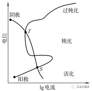 图8-7 不锈钢样品的伊文思原理图:表明具有两个稳定的腐蚀电位S和T