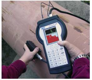 根据超声波脉冲反射原理来进行厚度测量的,当探头发射的超声波脉冲通过被测物体到达材料分界面时,脉冲被反射回探头,通过精确测量超声波在材料中传播的时间来确定被测材料的厚度。