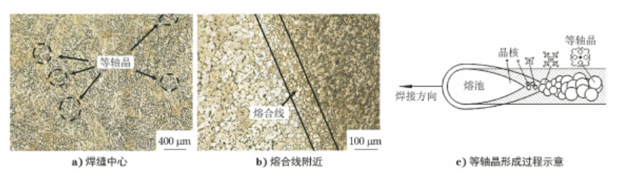 图3 焊缝中心、熔合区显微组织形貌和等轴晶形成过程示意