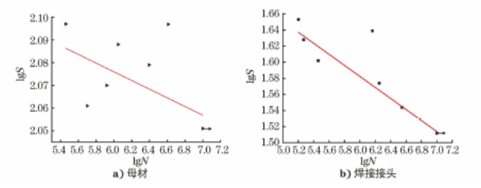 由图8可知,随着应力幅的降低,7N01铝合金母材及焊接接头的疲劳寿命明显增加。母材的k值小于焊接接头的,这说明随着应力幅的增加,焊接接头疲劳寿命下降得更快。