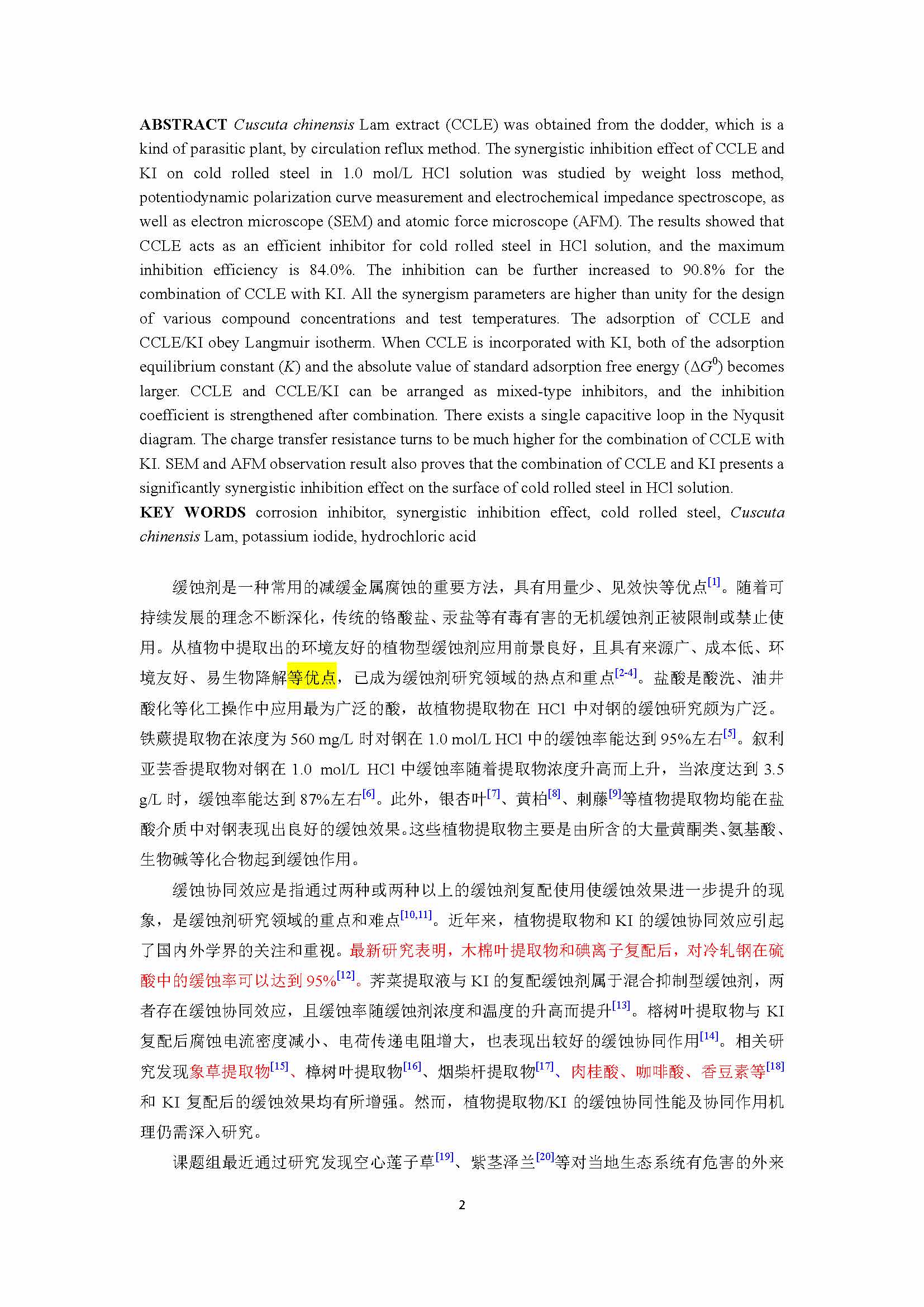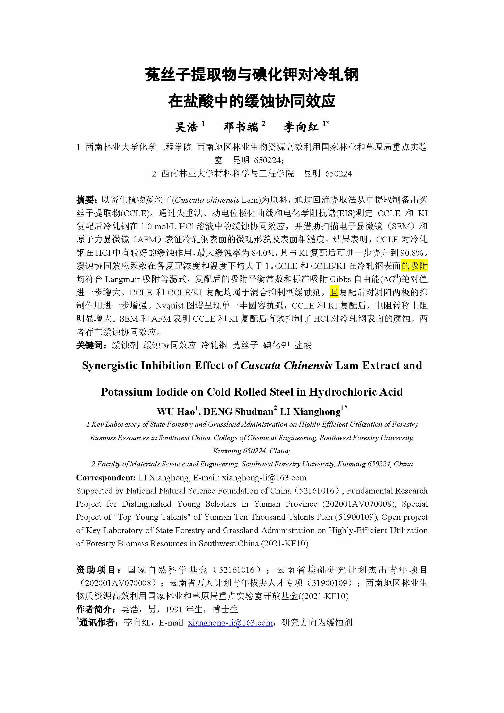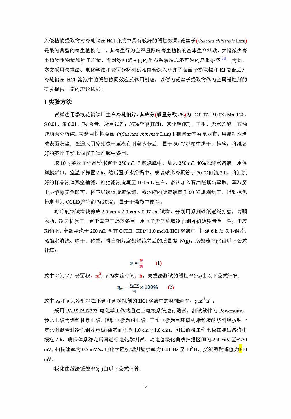 菟丝子提取物与碘化钾对冷轧钢在盐酸中的缓蚀协同效应