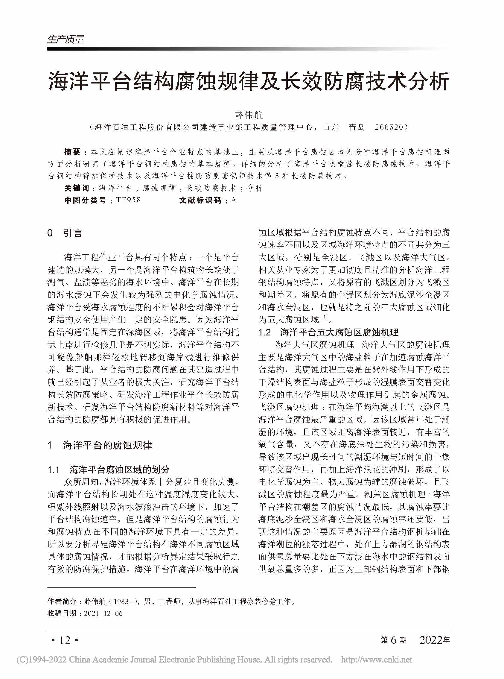 海洋平台结构腐蚀规律及长效防腐技术分析